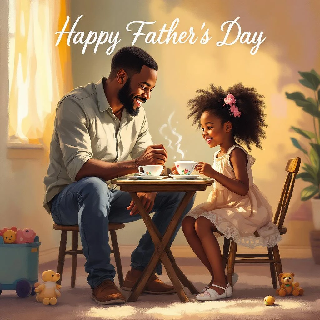 oil painting of a heartwarming scene of an African American father and his young daughter having a tea party. They are sitting at a small table, adorned with a delicate tea set, in a cozy, warmly lit room. The father is wearing a casual shirt and jeans, while the daughter is dressed in a cute, frilly dress. Both are smiling and enjoying their time together. The background features soft, pastel colors and a few toys scattered around, adding to the playful atmosphere. The text 'Happy Father's Day' is elegantly written in a stylish font, overlaying the image. The image must fit within the border.