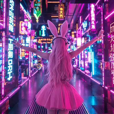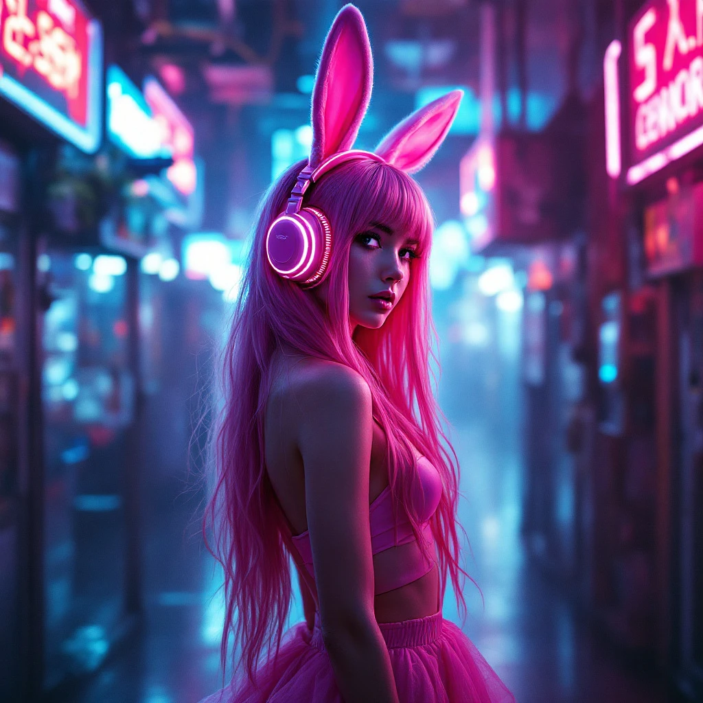 vaporwave style The pink bunny girl in the cyber world is a cyberpunk (full body photo) , with beautiful long hair, wearing a pink skirt, pink bunny ears, pink headphones, neon lights, and a sense of technological future. Phase One XT IQ4 150MP, low exposure, high contrast, ISO 50, with an 80mm prime lens. . retro aesthetic, cyberpunk, vibrant, neon colors, vintage 80s and 90s style, highly detailed