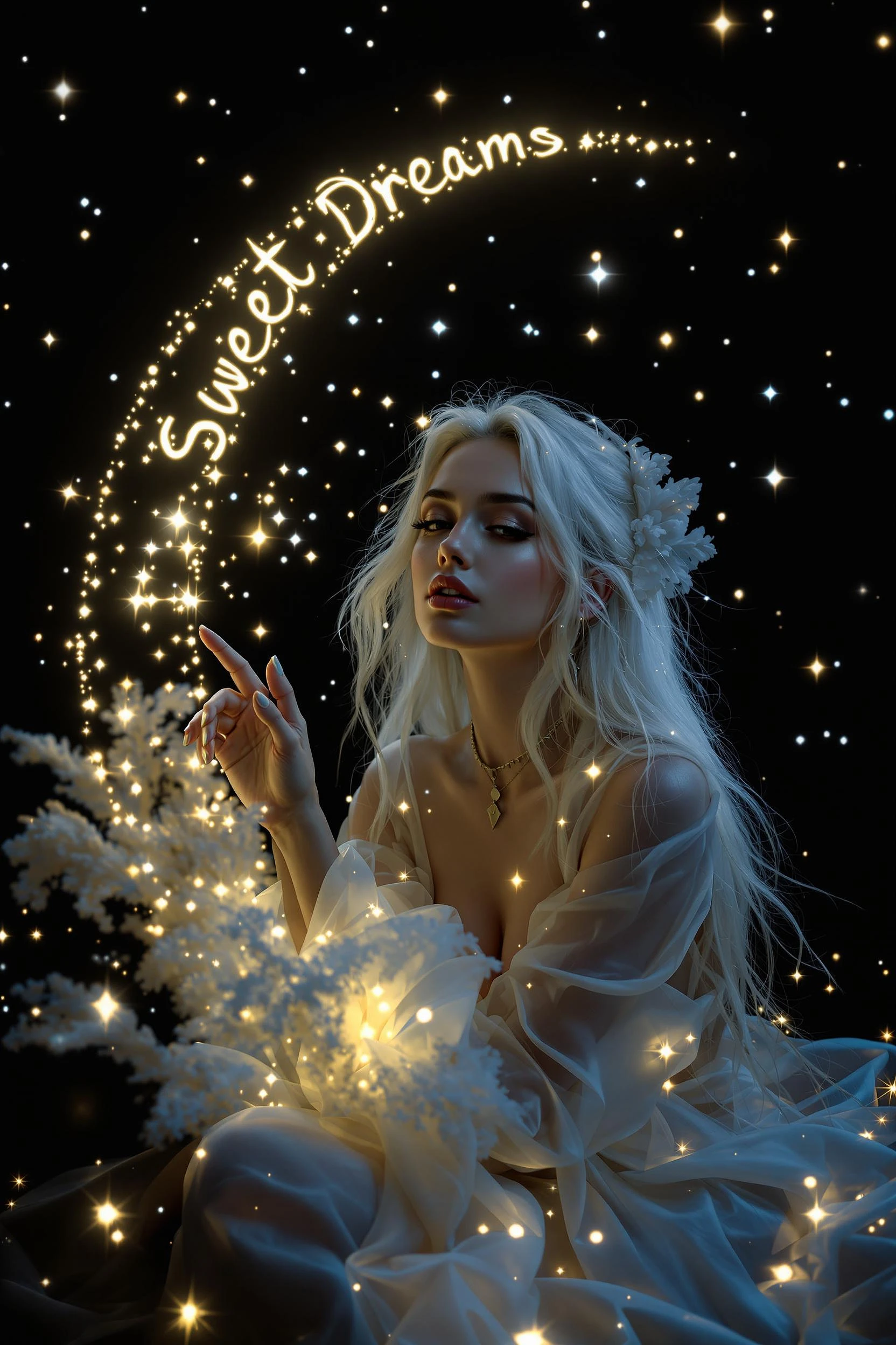 Un portrait fantastique sombre enchanteur et vibrant, capturant une femme aux cheveux longs et flottants et à la peau claire assise à côté d'un croissant de lune brillant. La pièce maîtresse est une écriture dorée qui épelle brillamment « Sweet Dreams », chaque lettre étant accentuée par une étoile unique et brillante. La femme est vêtue d'une robe blanche translucide et éthérée, rappelant l'eau ou la glace, et tend la main vers une étoile brillante. La scène sereine se déroule sur un fond noir profond, mettant en valeur la luminosité de la lune et des étoiles, créant une illusion captivante et cinématographique. , vibrant, cinématographique, photo, illustration, photographie de portrait, dark fantasy
