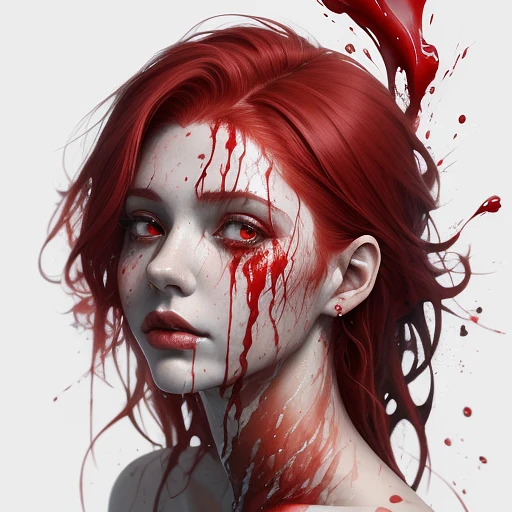 A half body portrait of a woman made of blood, half body is submerged in blood, red hair depicting a waterfall, drops of water on the face and body, tears of blood, concept art inspired by Alberto Seveso, abstract artstyle, intricate, watercolor explosion painting, digital painting, 2d render, 8k, trending on artstation