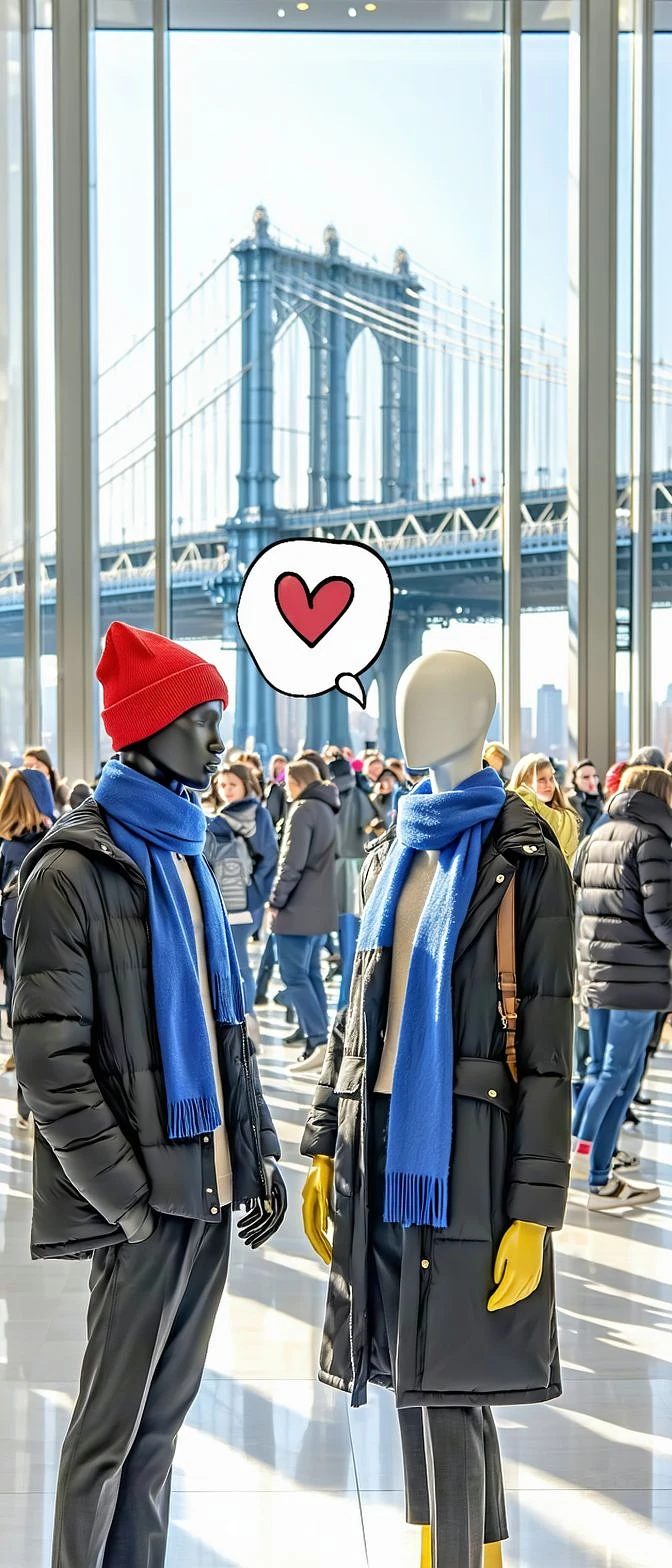 A bustling New York department store on a sunny winter morning, with the Brooklyn Bridge visible through large windows. Two mannequins - a black male and a white female - stand apart wearing H&M winter collection outfits with matching red beanies, blue scarves, and yellow gloves. The mannequins are hand-drawn in black and white pencil style like in A-ha's "Take on Me" video, while the background is hyperrealistic color photography. The male mannequin has a thought bubble containing a simple heart symbol (❤️) , looking toward the female mannequin across the crowded store.