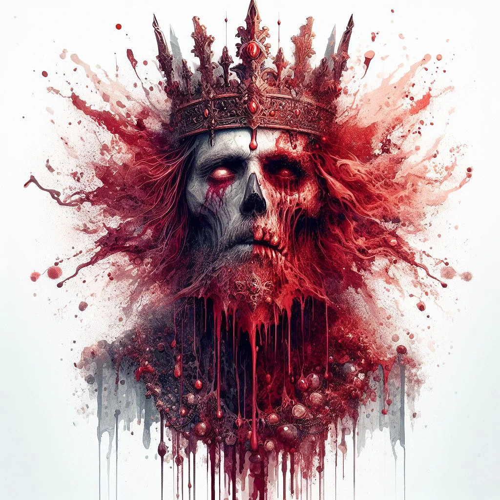A half body portrait of Undead king with crown and necklace made of blood, , drops of water on watercolor explosion painting, digital painting, 2d render, 8k, trending on artstation