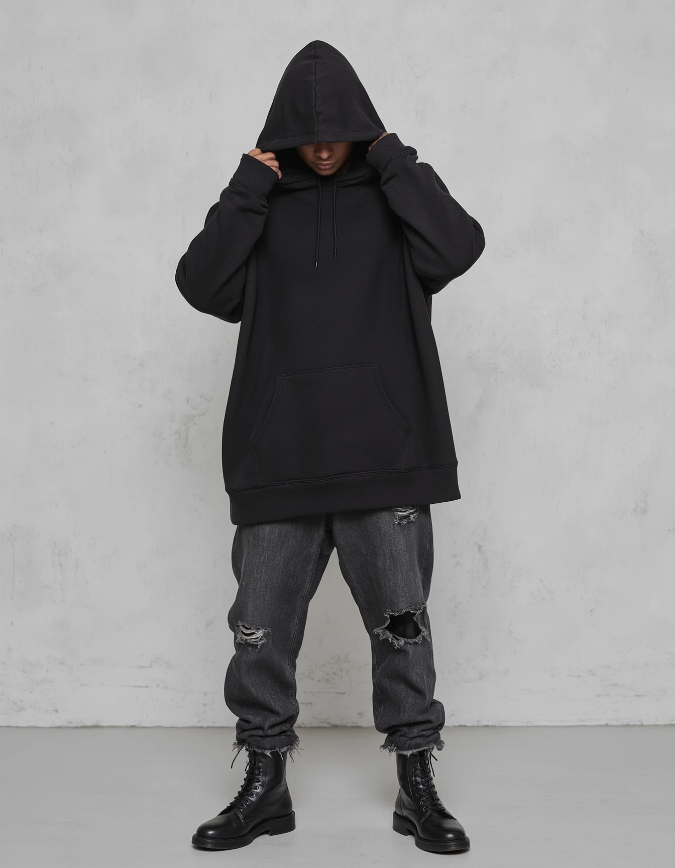 A person wearing an oversized black hoodie with the hood up, obscuring their face. They are also wearing dark, distressed jeans with frayed edges and large black boots. The background is a plain, textured concrete wall, creating an urban, minimalist atmosphere.