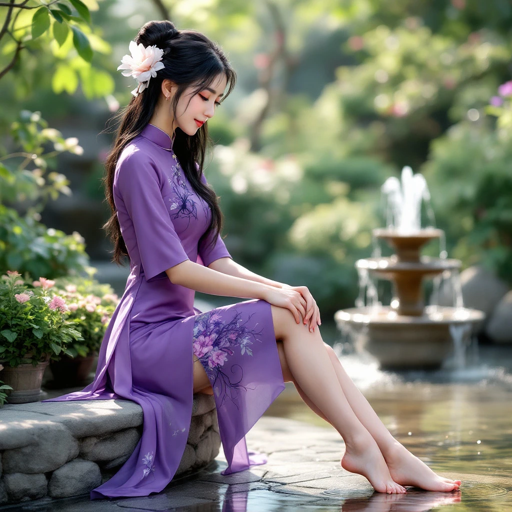 full body view a dark haired korean girl dressed in an asian style, very short purple Cheongsam, long legs, flower in the hair, barefoot photorealistic in zen garden. near a litttle fountain. Natural anatomy. Only two legs, two arms, only 5 fingers in each hand, only 5 toe on feet
