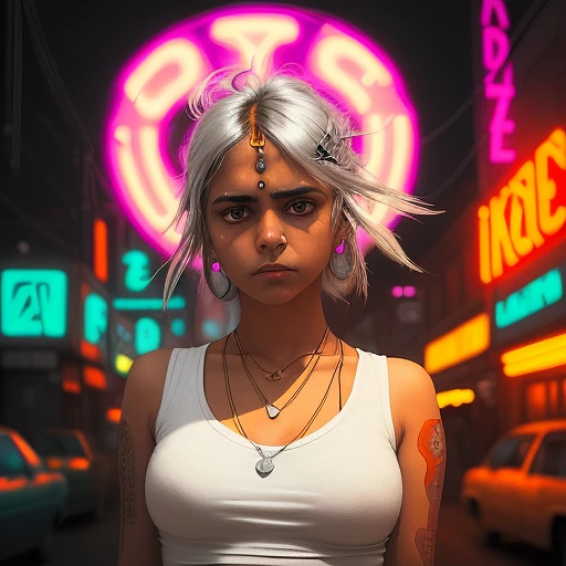 a girl in a white top in a neon city, in the style of indianpunk, iconic album covers, soft-focus portraits, luke fildes, light amber and silver, exotic, captivating lighting --ar 1:2 --stylize 750 --v 6