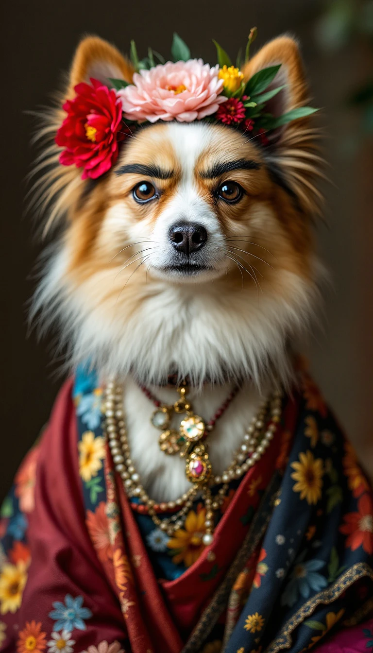 A dog dressed up as Frida Kahlo, Japanese Spitz, with flowers on its head and an eyebrows-on-eyebrows pose, which is a recreation of the real character. --ar 26:37 --v 5. 2