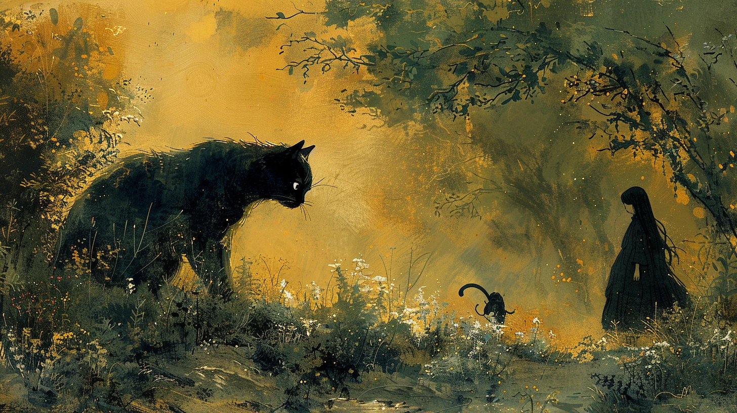 A Ghibli-inspired scene with a playful cat -- loyal dog -- child protagonist exploring a magical forest -- soft pastel palette -- vibrant greens -- warm earth tones -- whimsical realism -- rounded soft edges -- organic forms -- hand-painted look -- watercolor effects -- flowing expressive linework -- balanced composition -- depth through layering -- enchanted slice-of-life scene -- Studio Ghibli style --v 6 --ar 16:9 --s 600 --q 2 --style raw --c 20 --chaos 10
