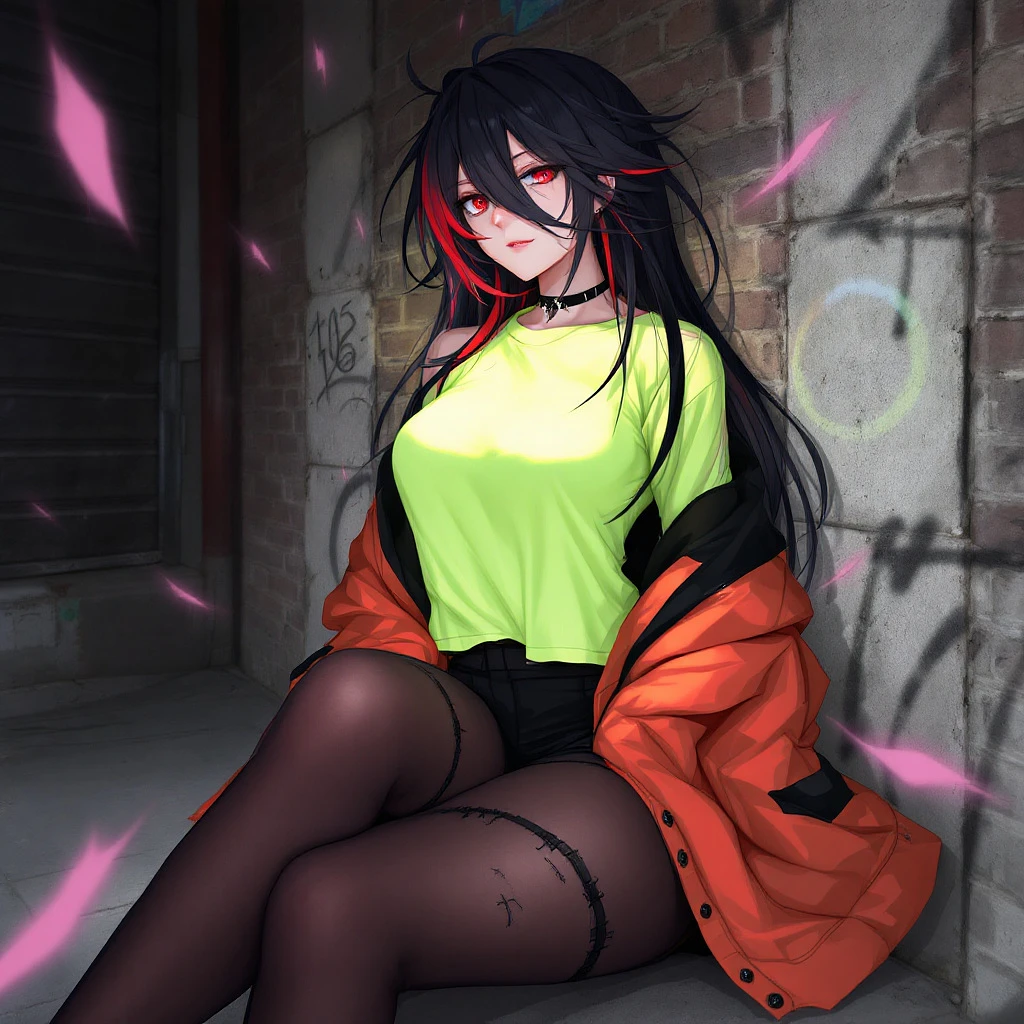 female, (masterpiece:1. 2) , ( best quality:1. 1) , 1girl, thick thighs:1. 8, black pantyhose:1. 2, intricate details, chromatic aberration, 1girl, long hair, black hair, messy hair, red highlights, hair over one eye, red eyes, sharp eyes, choker, neon shirt, torn legwear, open jacket, against wall, brick wall, graffiti, dim lighting, alley