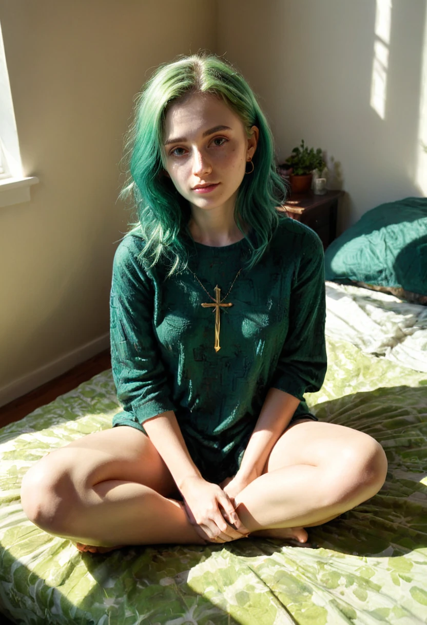 <lora:xl_more_art-full_v1,:1> , <lora:DreamARTSDXL,:1> , A serene oil painting of a 22-year-old woman with emerald-green hair sitting cross-legged on a sunlit bedspread, surrounded by soft focus of her home decor. The natural light casts warm shadows across her face and the vibrant green sheets.