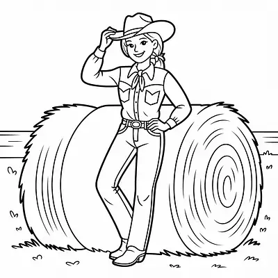 "Cowgirl standing beside a hay bale with one boot propped up, smiling and holding her hat, wearing a Western-style tied shirt and jeans, bold black outlines, clean background, coloring book illustration"