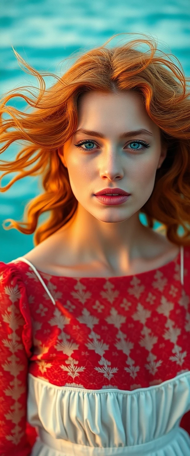 "Image is a high resolution close up head and shoulders portrait of a lithe redhead supermodel, fair complexion, voluminous copper red hair, soft curls, blowing in a strong breeze, vivid sapphire blue eyes, parted full pink lips, serene expression. Cinematic style, golden hour light, soft pastel colours, crisp scarlet lace dress over white petticoat. Turquoise ocean backdrop, soft, gentle light, fashion based composition, editorial style, soft contrast and saturation. "