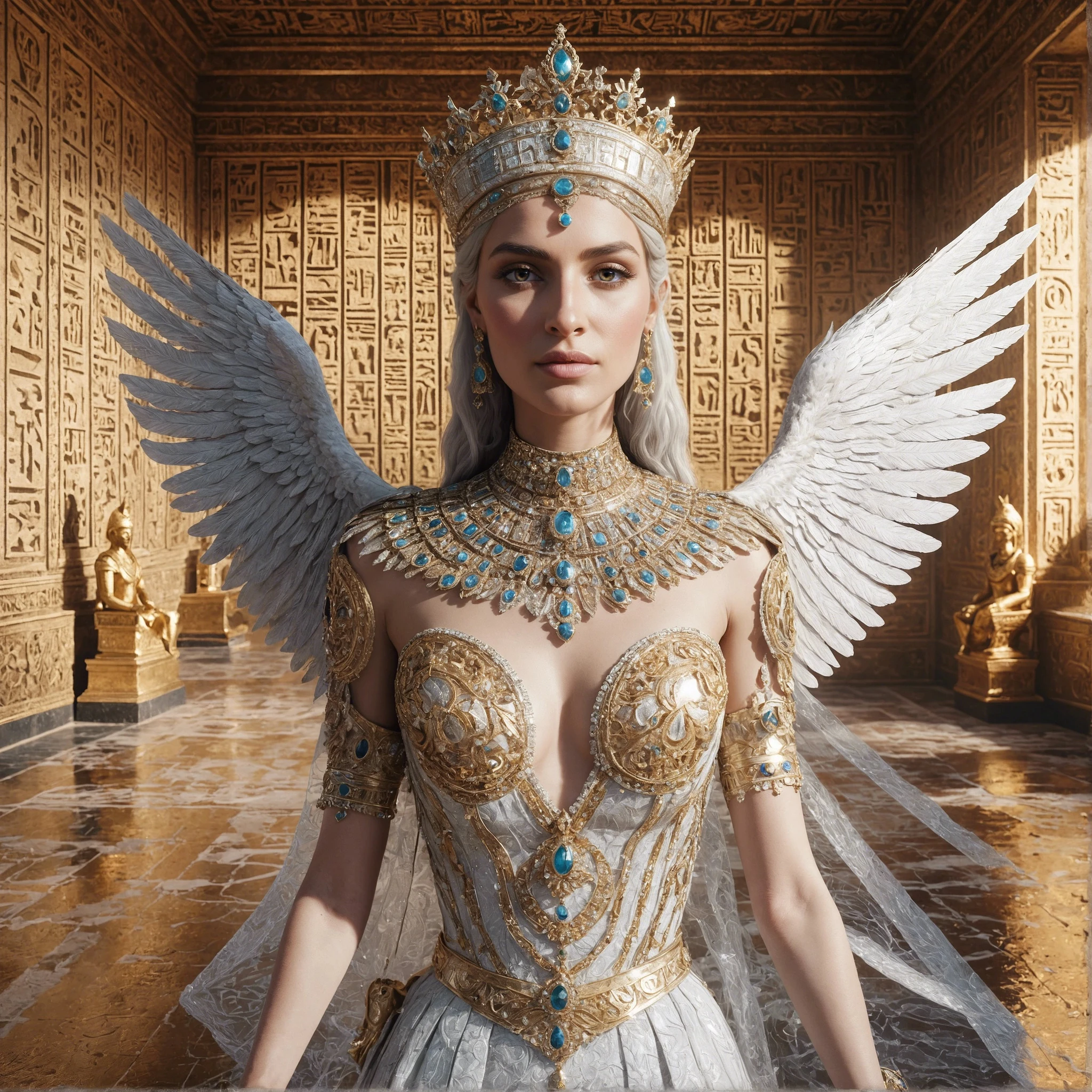 In this portrait, Isis stands regally in her Diamond skin, surrounded by the opulence of an ancient Egyptian palace. The walls are adorned with intricate hieroglyphics and golden accents, and the floor is made of gleaming marble. Isis herself wears a stunning white gown, trimmed with gold and encrusted with diamonds. Her wings are spread wide, and her eyes seem to glow with an otherworldly power. The use of advanced 3D modeling and texturing techniques