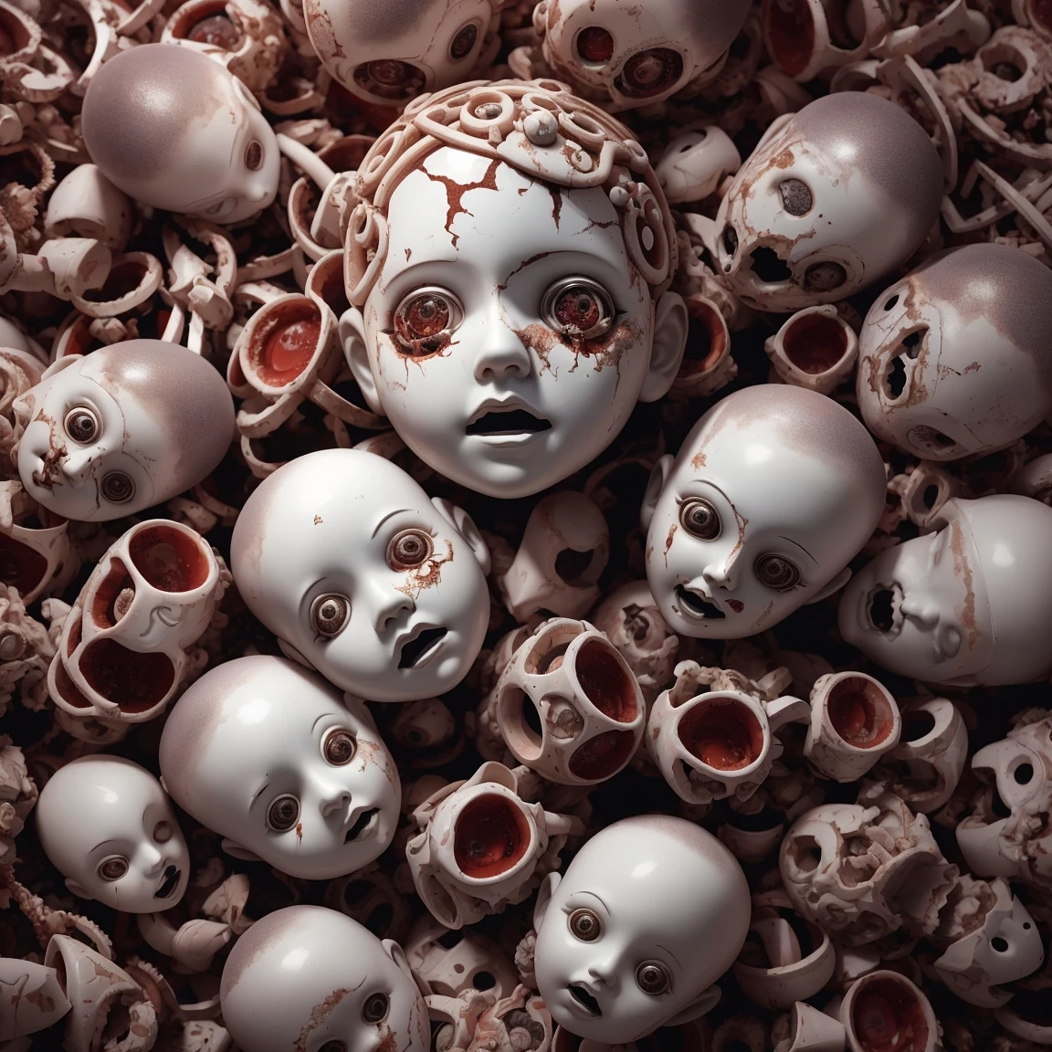 photo of a pile of nanoscopic scary babydoll heads and severed body parts creatures, packed tightly, fill frame, wide-angle, top-down view, 8k, highly detailed, shiny , sliced brain, hacked parts, eyeball sections, blood with chunks of innards pattern background, dissected parts, bone fragments, cinematic photography, vray, photorealistic, arms, legs, guts, in the stlye of hr giger
