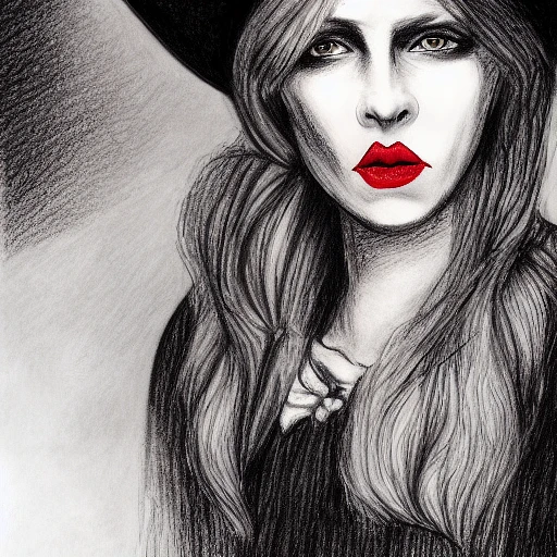 a drawing of a pale female with straight ginger hair hazel eyes, a serious expression, and red lipstick in the style of wildwest gothic, western-style portraits, sharp focus, moody lighting, realistic figures, wearing a black cowboy hat