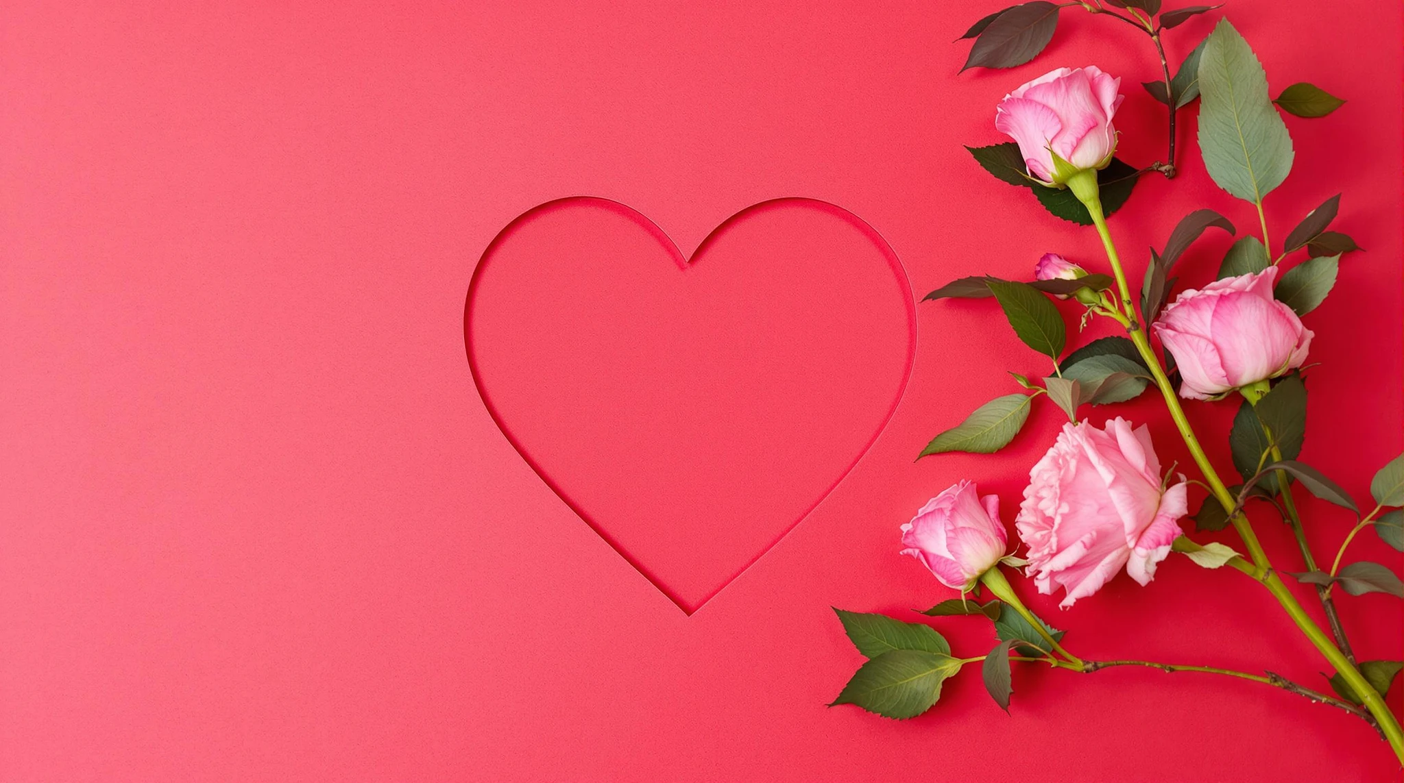Heart-shaped cutout, Red background, Pink roses, Green stems and leaves, Valentine's Day theme, Romantic composition, Floral arrangement, Love symbol, Contrast of colors, Overhead view, Delicate petals, Flat lay photography, Symmetrical design, Paper craft, Vibrant colors, Minimalist style, Nature meets geometry, Seasonal decoration, Artistic floral display, Textured paper