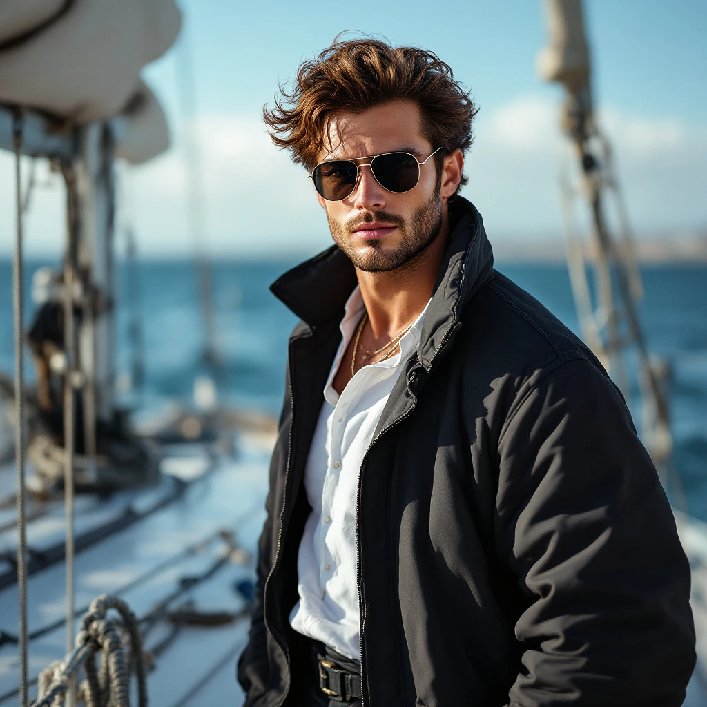 A stunning brunette man with sunglasses stands on the deck of a sailboat, high-resolution photograph, photorealistic, in the style of commercial photography --ar 1:2 --stylize 750