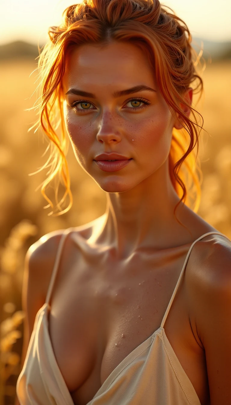 Cinematic still A close-up of an attractive, red hair woman in her early 20s wearing a wet linen dress with an open neckline. Her eyes are squinted because of the bright sunlight. Her tanned skin glistens with visible drops of sweat. We can see beads of sweat on her cleavage. The background shows blurred golden wheat fields, creating a dreamy, sunlit atmosphere. The image is photorealistic, high-quality, and detailed, capturing the warmth of the summer scene. . emotional, harmonious, vignette, highly detailed, high budget, bokeh, cinemascope, moody, epic, gorgeous.