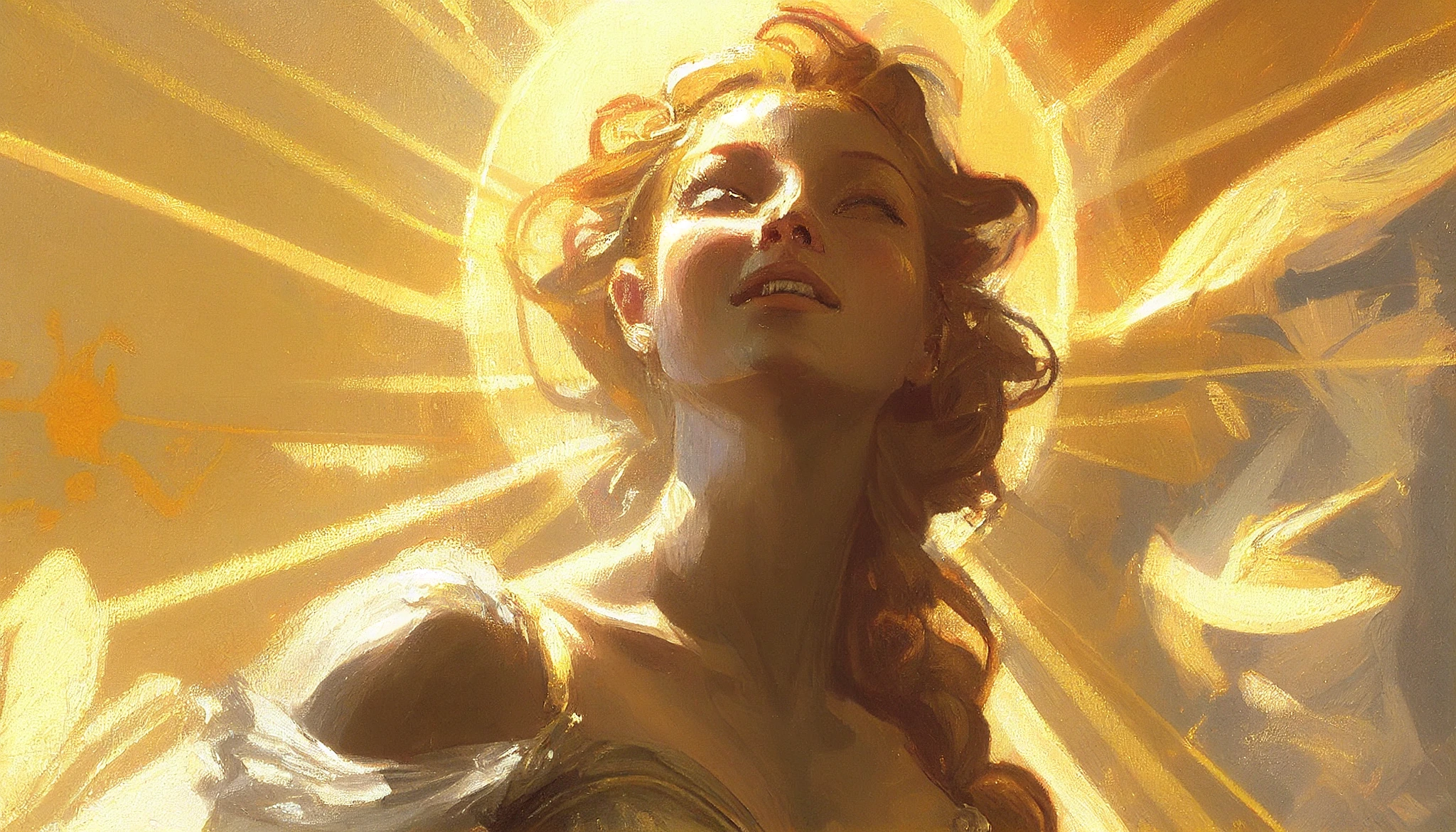 goddess, ethereal, woman, god rays, acrylic, Golden hour sunlight, by Vincent van Gogh, by Claude Monet, by Rembrandt, Impressionism, V-Ray, Close-up perspective --quality 5 --ar 16:9