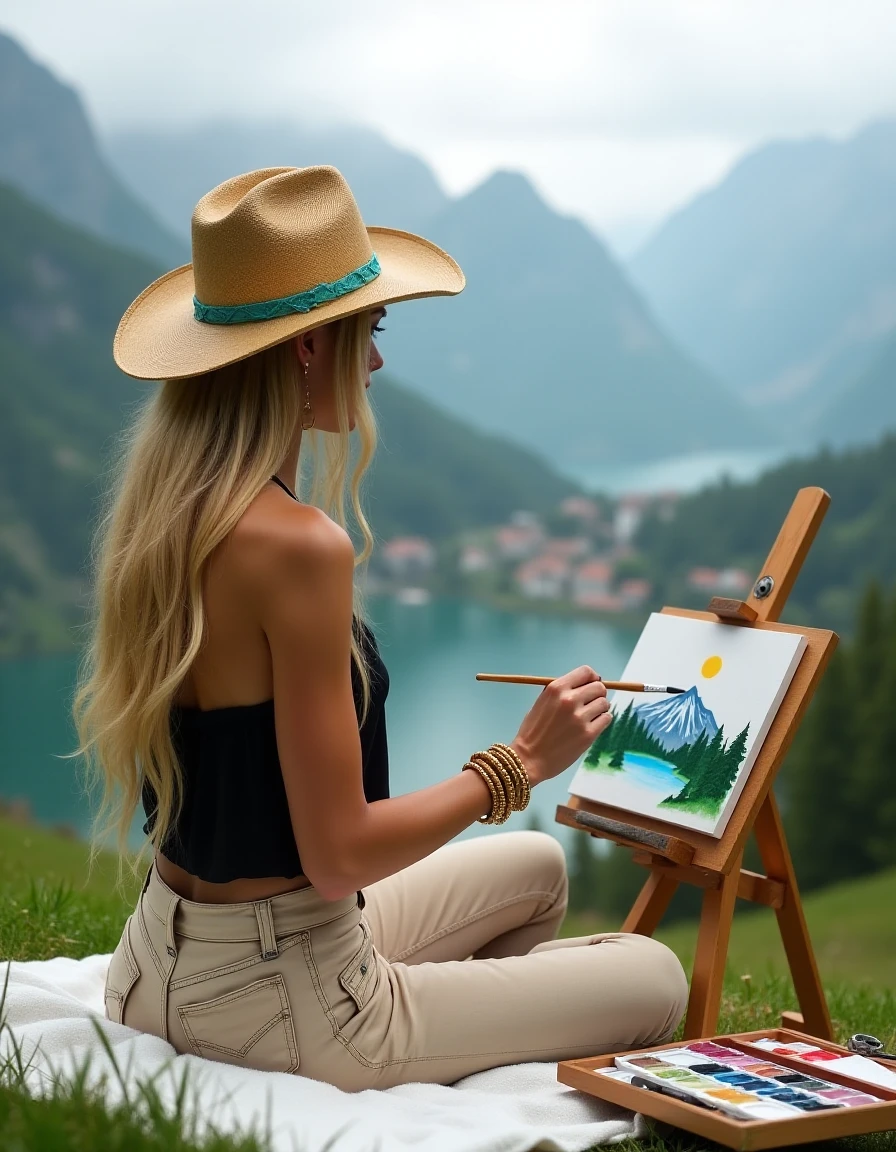 (ultra-realistic:1.2) A beautiful young woman with long blonde hair and a boho-cowgirl vibe paints a serene lakeside landscape, seated on a grassy hillside overlooking misty mountains and a calm lake. She wears a straw cowboy hat with turquoise detailing, a black strapless top, light beige pants, and bold gold bangles. Her easel holds a canvas with a colorful mountain scene in progress, surrounded by watercolor palettes and brushes on a white blanket. The sky is overcast, diffusing soft natural light across the lush greenery and distant lakeside village. (photorealistic:1.3) (50mm lens, f/1.8, shallow depth of field, 8K) —ar 4:5 —v 5 —q 2 —style raw