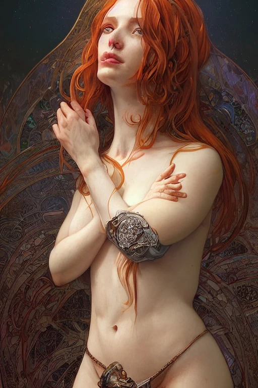 1girl, a real perfect female anatomy of ginger, sweaty naked upper body, beautiful naked woman with a beautiful symmetrical face partly wearing romantic armor, breasts, cyberpunk art by greg rutkowski and alphonse mucha extremely intricate details! , ultra realistic digital painting in the style surrealism! studio lighting light photography trending on Artstation 8k sharp focus! ! ! hq high quality artwork masterpieces