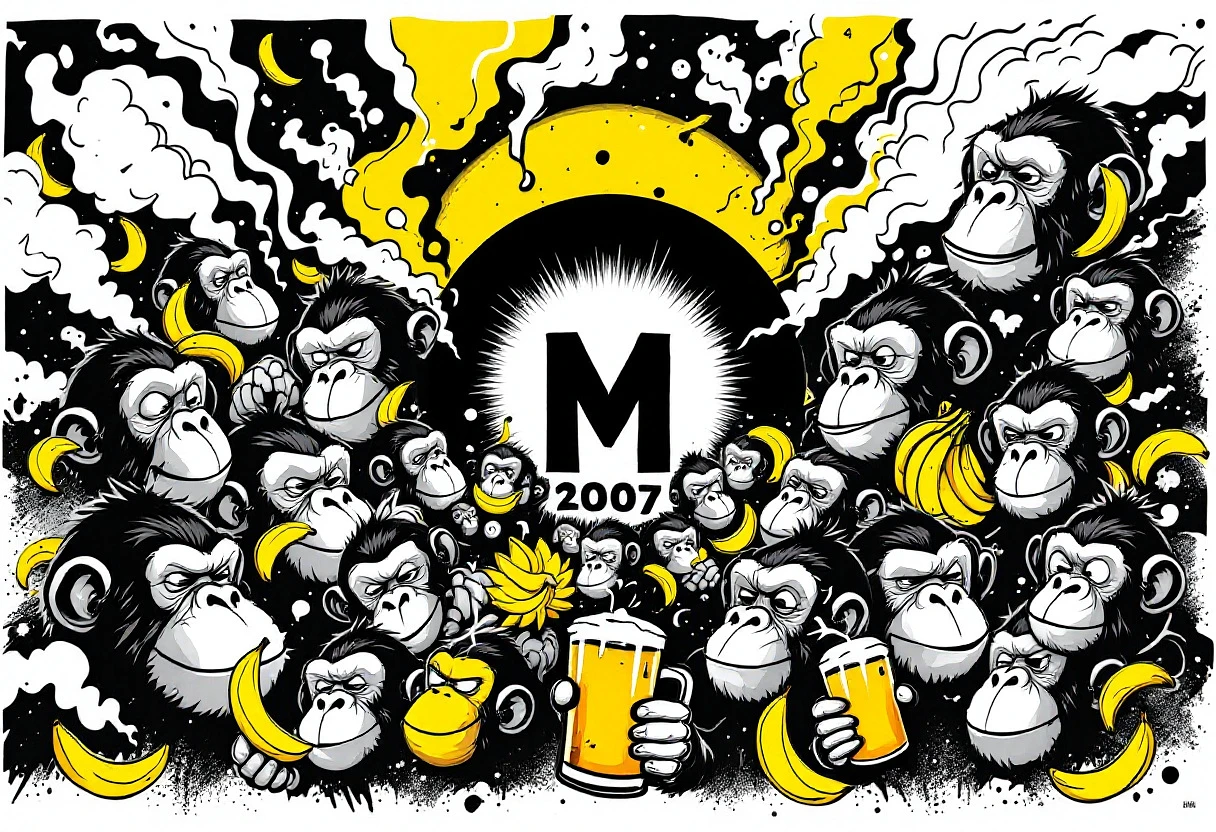 An intricate and mainly black, white, yellow, green, (two contrasting, extra colors for details) , graffiti-style poster featuring various elements, such as 30 chimp cartoon characters, symbols of urban culture, smoke and dynamic expressions, focusing on minimalistic chimp faces, the letter 'M' inside a large circle, bananas, beer, is part of the image. the word and '2007' is hidden --ar 63:128 --stylize 750