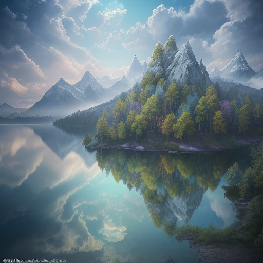 Colorful, Detailed, 4k, Ultra Hd, Realistic, Vivid Colors, Highly Detailed, UHD Drawing, Pen And Ink, Perfect Composition, Beautiful Detailed Intricate Insanely Detailed Octane Render Trending On Artstation, 8k Artistic Photography, Photorealistic Concept Art, Soft Natural Volumetric Cinematic Perfect Light, lake blue crystal, mounteins tiny, clouds bright, tree green. Day. sun brigth. Child seetdown on tree epic on the background