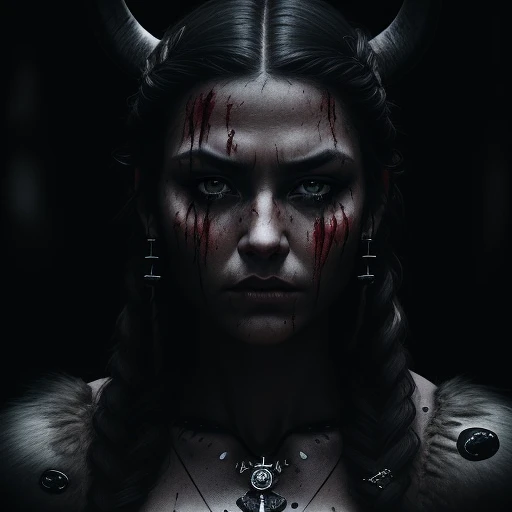 cinematic film still dramatic side lighting, dramatic intense stare closeup portrait, dark black background, hdr, dramatic beautiful warrior woman with warrior face paintings and blood, dark hairs, viking braids, pelt, skull necklace, shallow depth of field, vignette, highly detailed, high budget Hollywood film, cinemascope, moody, epic, gorgeous