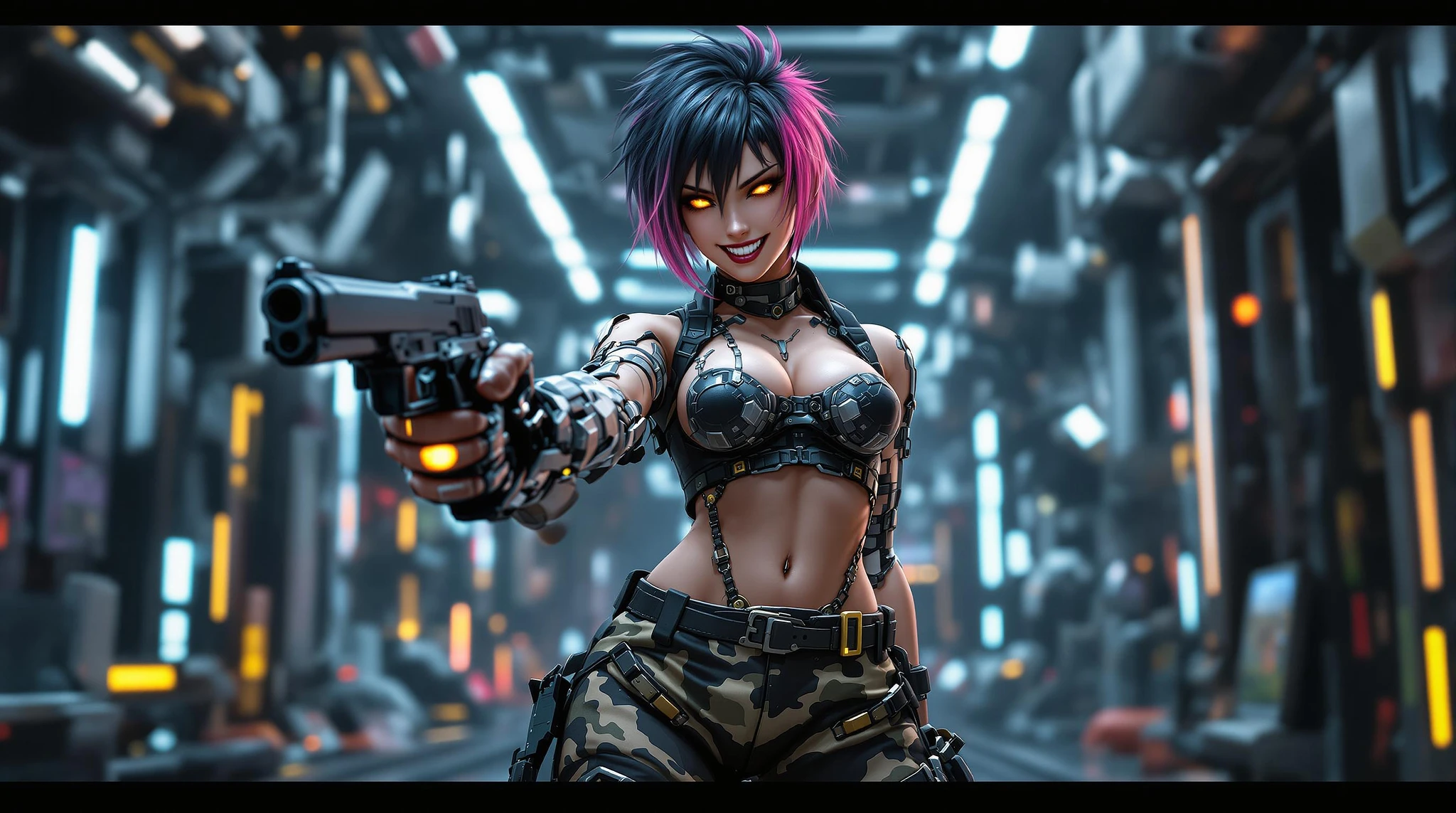 The full-body image depicts a futuristic, cybernetic female character with a striking appearance. She has short, spiky hair that transitions from dark to vibrant pink at the tips. Her facial features are sharp and expressive, highlighted by glowing orange eyes and a wide, confident grin that reveals her gritted teeth. Her skin displays signs of cybernetic enhancements, including metallic implants and intricate designs etched onto her arms. One arm is partially mechanical, showcasing a blend of organic and artificial elements, while she confidently holds a handgun aimed toward the viewer. She is dressed in baggy tactical pants featuring city camouflage and elements of cybernetics. The background presents a high-tech setting, suggesting a sci-fi environment filled with various futuristic details and lighting. The overall tone is intense and action-oriented, emphasizing the character's boldness and strength.
