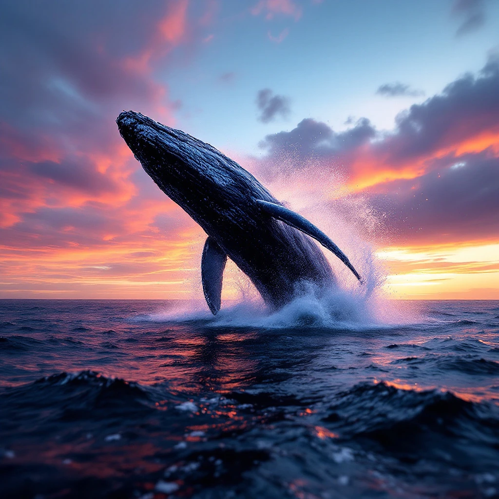 A huge humpback whale breaches out of the water, the splash of water is spectacular and shocking, and the vibrant orange-blue-purple sunset sky adds to the soft atmosphere