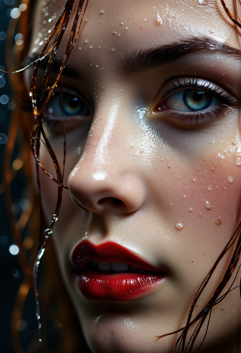 A striking and intimate portrait of a woman's face captures the essence of a her features amidst the turmoil of a rainy day. Her long, wet auburn hair hangs limply over one side of her face, as though weighed down by the relentless precipitation - this tangled mass creates a sense of dynamic movement around her stillness. Her eyes are sapphire jewels that stare directly into the viewer's soul, piercing and intense. The deep blue irises seem almost otherworldly against the dark backdrop of the rainy day, drawing attention to their captivating beauty. Her lips are painted with a bold, crimson red lipstick that adds a touch of sensuality to her already alluring presence. The mouth is slightly open, revealing a hint of vulnerability and tension - this subtle gesture conveys a sense of strain or perhaps frustration amidst the downpour. Rainwater runs down her face, creating tiny rivulets that accentuate the delicate curves of her features. The overall effect is one of stark contrast between her vibrant, inner world and the dismal, rainy day that surrounds her. The extreme close-up creates an intense, personal connection with the viewer, drawing them into the intimate space shared by this woman and the rain-soaked atmosphere. Every detail - from the tangled hair to the rivulets of rainwater - invites the viewer to explore the intricate beauty of the image.