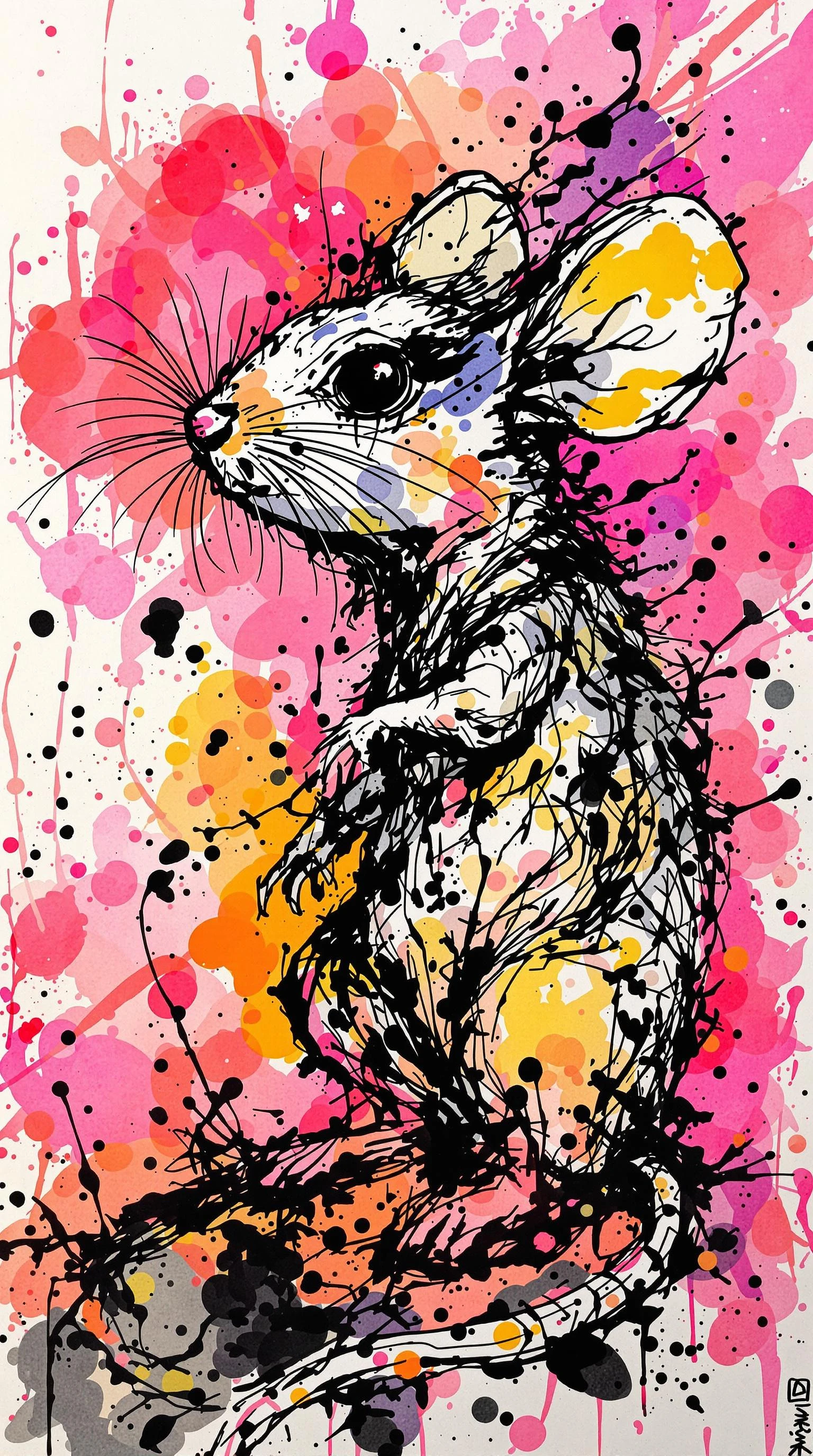 Mouse, detailed, ink style, Ink splash art on the background, ink style, The whole is on the right,Ink wraps around the body, and the ink obscures the subject, Colored