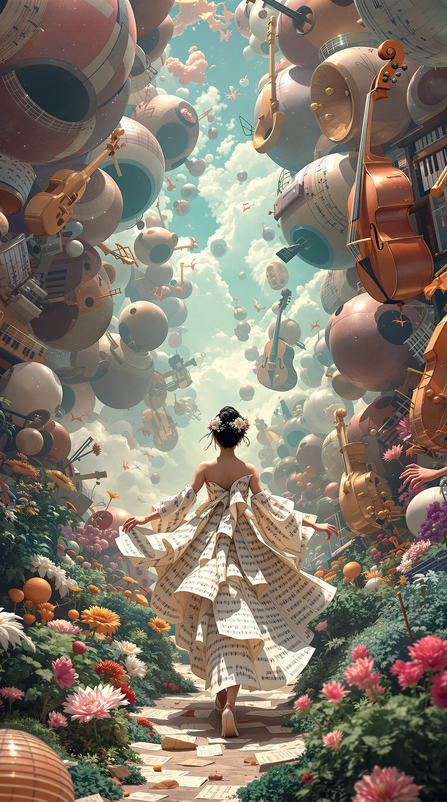 A whimsical, full-body scene of a chineswoman walking through a landscape made of giant, floating musical instruments, each playing a different tune that forms a symphony of wonder and chaos, and her dress is crafted from a myriad of musical notations and scores, merging the joy of music with the imaginative power of playful dreamscapes.