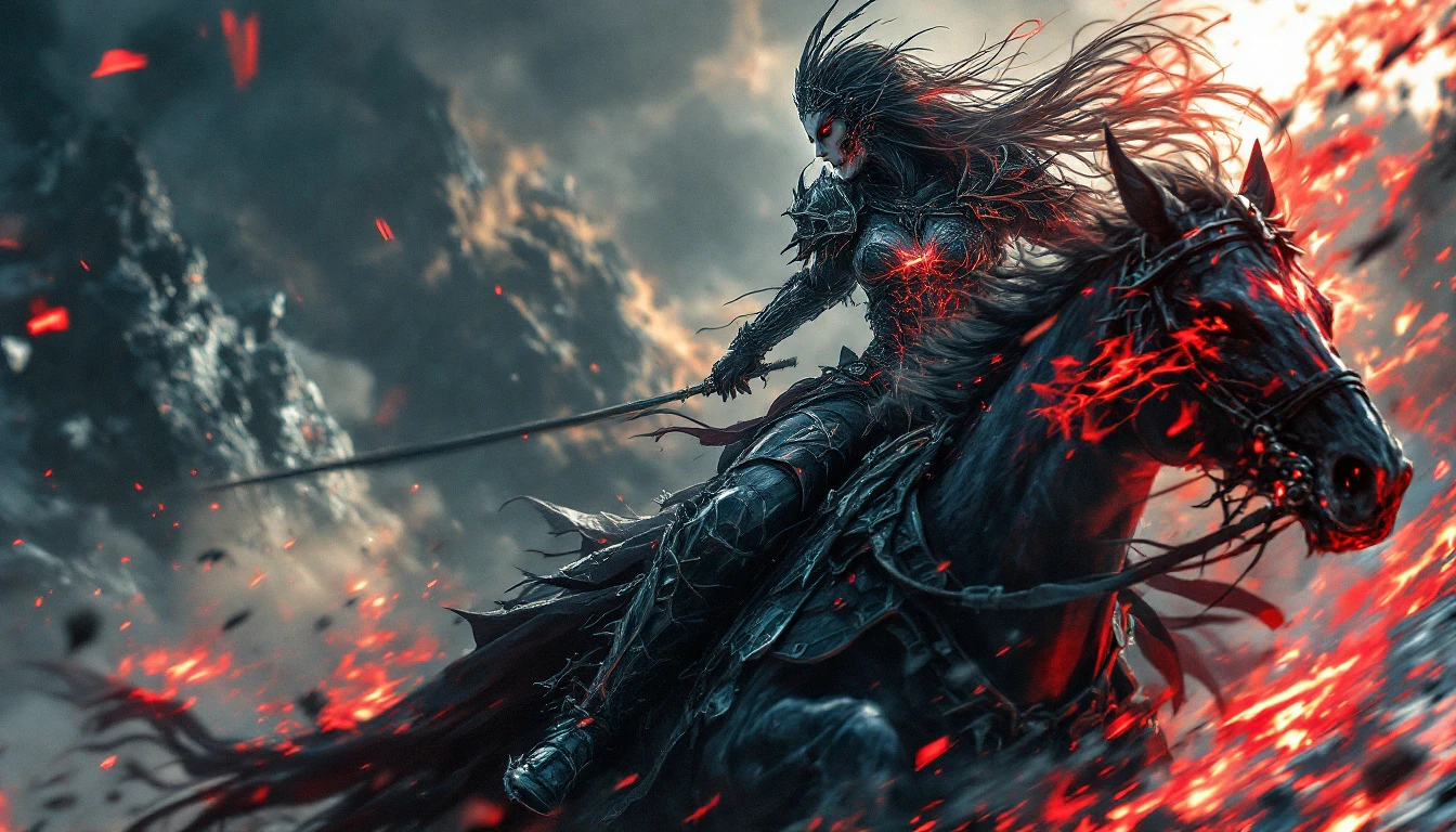 A female death knight on horseback charging into battle, trail cam footage, intense coloration fantasy, full body image, RAW photo, (masterpiece) , (extremely intricate:1.3) , (realistic) , cinematic lighting, detailed skin, highly detailed, extremely delicate and beautiful, 8k, high quality, highres, sharp focus, extremely detailed, during the day, extremely detailed eyes and face, masterpiece, cinematic lighting, (high detailed skin:1.2) , 8k uhd, dslr, soft lighting, high quality, film grain, Fujifilm XT3
