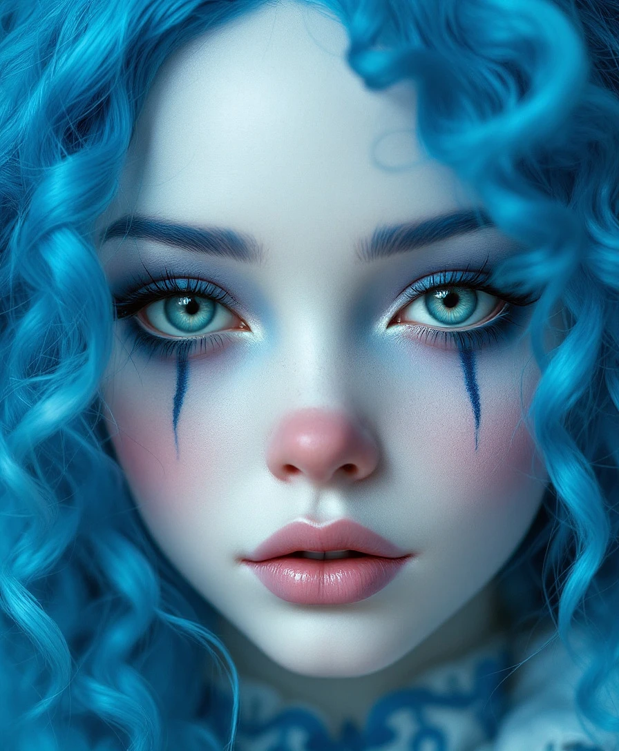 Prompt: Anne Bachelier, beautiful clown doll with an extremely pale, clean and clear face, fair skin and beautiful long blue curly natural hair, surrealism, rococo, baroque, romanticism, symbolism, impressionism, fantasy, vibrant blue, ethereal, whimsical, soft brushstrokes textured intricate details HD