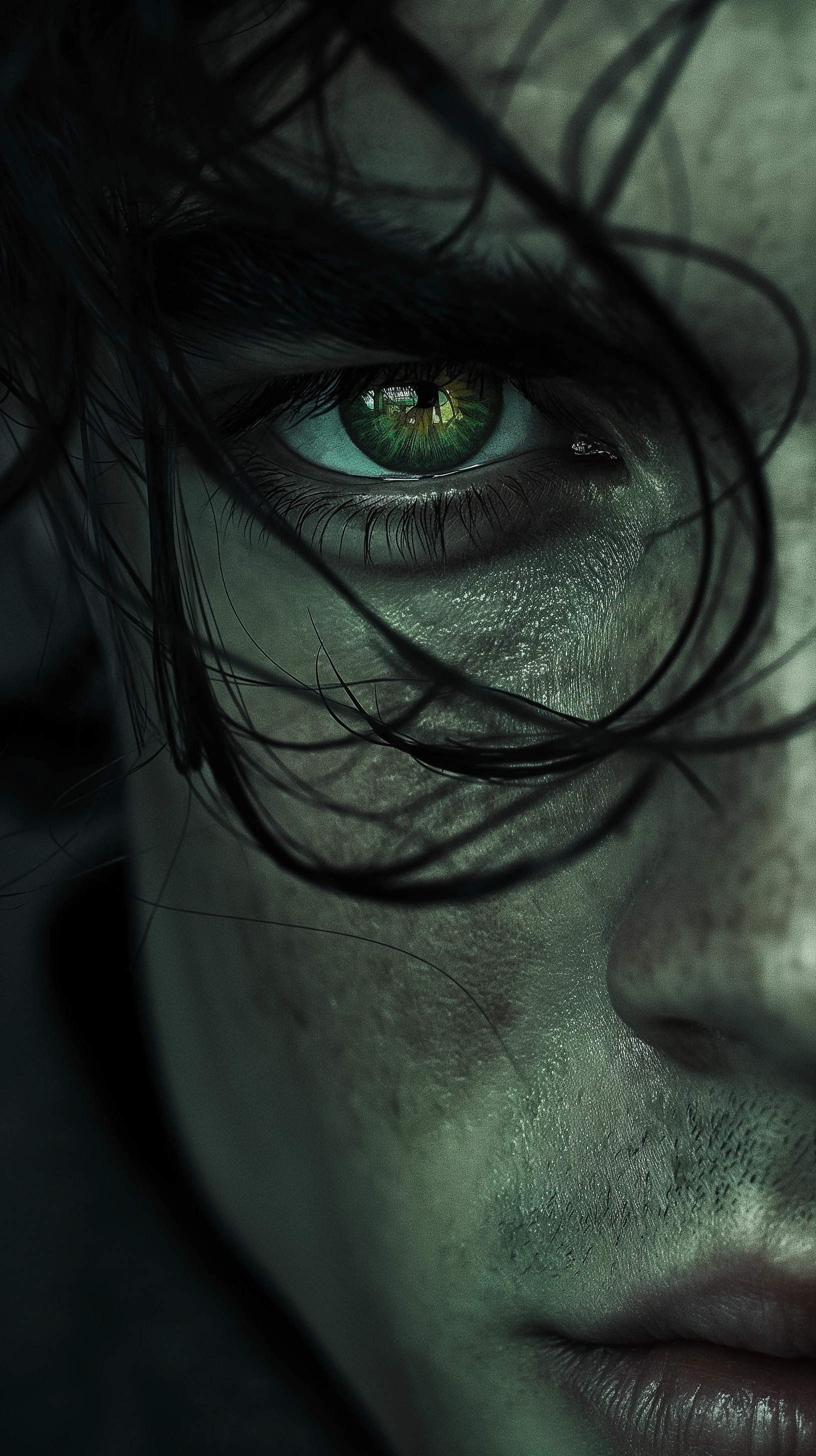 dark monochrome portrait of a caucasian man, face serene and features sharp, framed by flowing dark hair, colored close-up of his eye and part of his cheek, showing intricate details like the iris pattern and skin texture, contrast highlights a dual perception theme, dark grey, solid green background to draw focus to the facial features, photorealistic, UHD --ar 9:16 --stylize 300