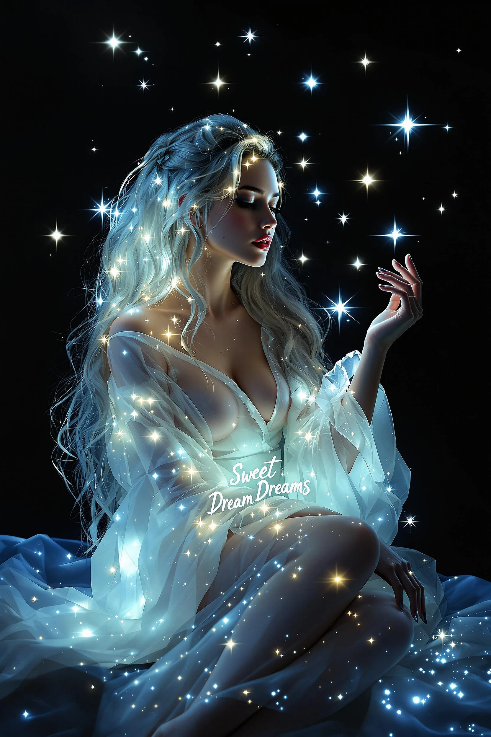 Un portrait fantastique sombre enchanteur et vibrant, capturant une femme aux cheveux longs et flottants et à la peau claire assise à côté d'un croissant de lune brillant. La pièce maîtresse est une écriture dorée qui épelle brillamment « Sweet Dreams », chaque lettre étant accentuée par une étoile unique et brillante. La femme est vêtue d'une robe blanche translucide et éthérée, rappelant l'eau ou la glace, et tend la main vers une étoile brillante. La scène sereine se déroule sur un fond noir profond, mettant en valeur la luminosité de la lune et des étoiles, créant une illusion captivante et cinématographique. , vibrant, cinématographique, photo, illustration, photographie de portrait, dark fantasy