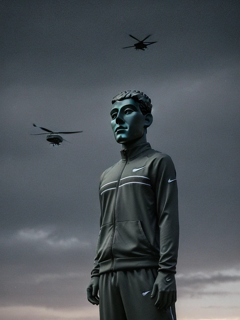 young man moai head using nike tracksuit, accurate symmetry of the sky, night time, rainy day, police helicopters flying over him, shoot with Sony Alpha a7R IV FE 70-200mm f/2. 8 GM OSS lens ISO 100, 8k, high definition, matte painting –w 2176 –h 3840 –iw 1 -v 5 --s 1000 --ar 7:4 --raw