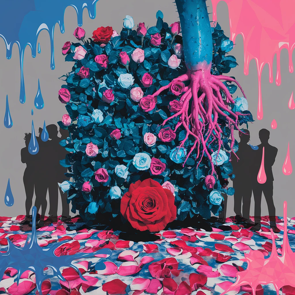 A red rose shines in front of an immense rose bush that creates a surreal wall of more various colors roses between a big creeper, which branch off at the foot as if they were pink roots hanging downwards as when they are put to dry, mysteriously under everything a carpet of rose petals varied between bright and more degenerate has been created, behind the wall of the rose bush shadows of people, Throughout the image there are jets of light blue and pink paint spilled, drops. . .