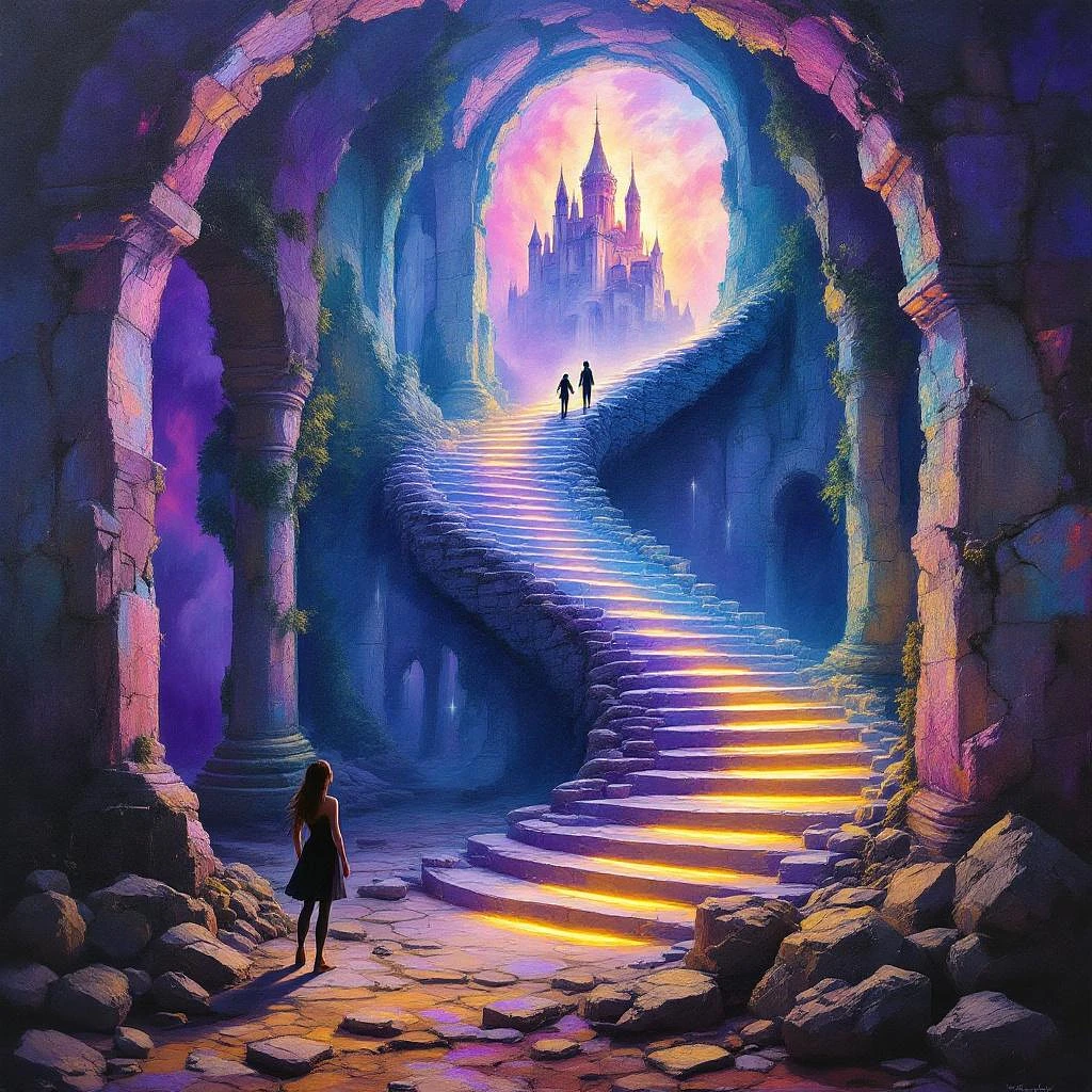 In this vivid surrealist painting, a female artist stands within the ruins of a forgotten world, capturing a vision that transcends time and space. As her brush dances across the canvas, a glowing staircase emerges through a crumbling archway, spiraling toward a luminous castle suspended in a violet-drenched dreamscape. A couple, hand in hand, ascends the path—part reality, part memory—manifested from the very pigments of the artist’s palette. The rich textures and glowing hues contrast the worn stone with the brilliance of creativity, illustrating the transformative power of imagination to shape new realms from decay. Here, the boundaries between the inner world and external reality dissolve, inviting the viewer to walk the path into their own subconscious wonder.