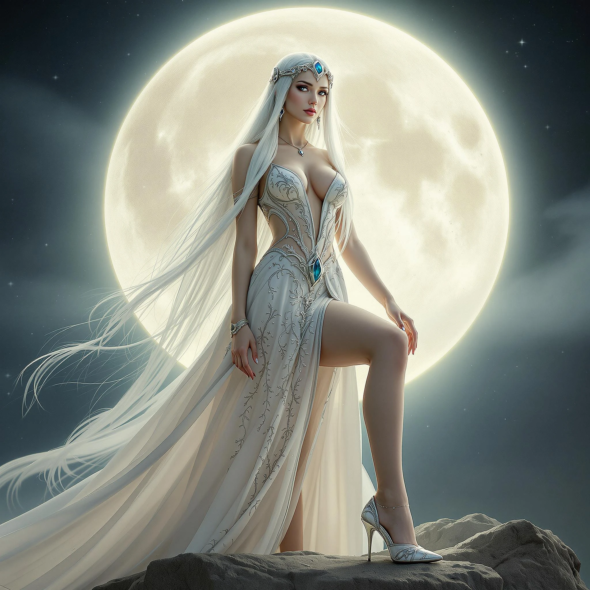 a woman in a fantasy setting, with a wide-angle perspective that captures the intricate details of her appearance and the background. Long, flowing white hair cascades down her back, Fair skin with a subtle, ethereal glow, her attire consists of a flowing white gown with a plunging neckline and a flowing train, the Gown is adorned with intricate silver embroidery and beading. She wears a Silver circlet on her head, featuring a large blue gemstone. Her Makeup is subtle, with a focus on enhancing her natural features. She stands confidently, with her weight shifted onto one leg, her other leg is bent at the knee, with her foot resting on a rock or pedestal. The background features a large, glowing moon, the moon is full and bright, with a subtle gradient effect that gives it a sense of depth and dimension. The sky around the moon is dark, with a few stars visible. The camera used is a high-end digital SLR with a wide-angle lens. The lighting is soft and diffused, with a subtle gradient effect that gives the image a sense of depth and dimension. The style is fantasy, with a focus on creating a sense of wonder and enchantment.