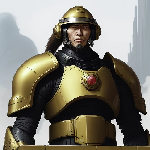 Illustration in manga style of a supreme commander observes his army marching on a colony orbiting Earth in a futuristic setting. The commander, tall and imposing at 40 years old, has a Neanderthal-like anatomy but walks proudly upright. Hairless with yellow skin, his simple yet impressive technological armor fits snugly, especially his helmet. His expression mixes arrogance with underlying suffering, eyes sharp and seasoned by war. Both his and his army's armor is as black as the deepest night, tightly fitting their bodies. Hundreds of thousands of soldiers, each in similar sleek black armor adorned with subtle lines of pulsating blue light