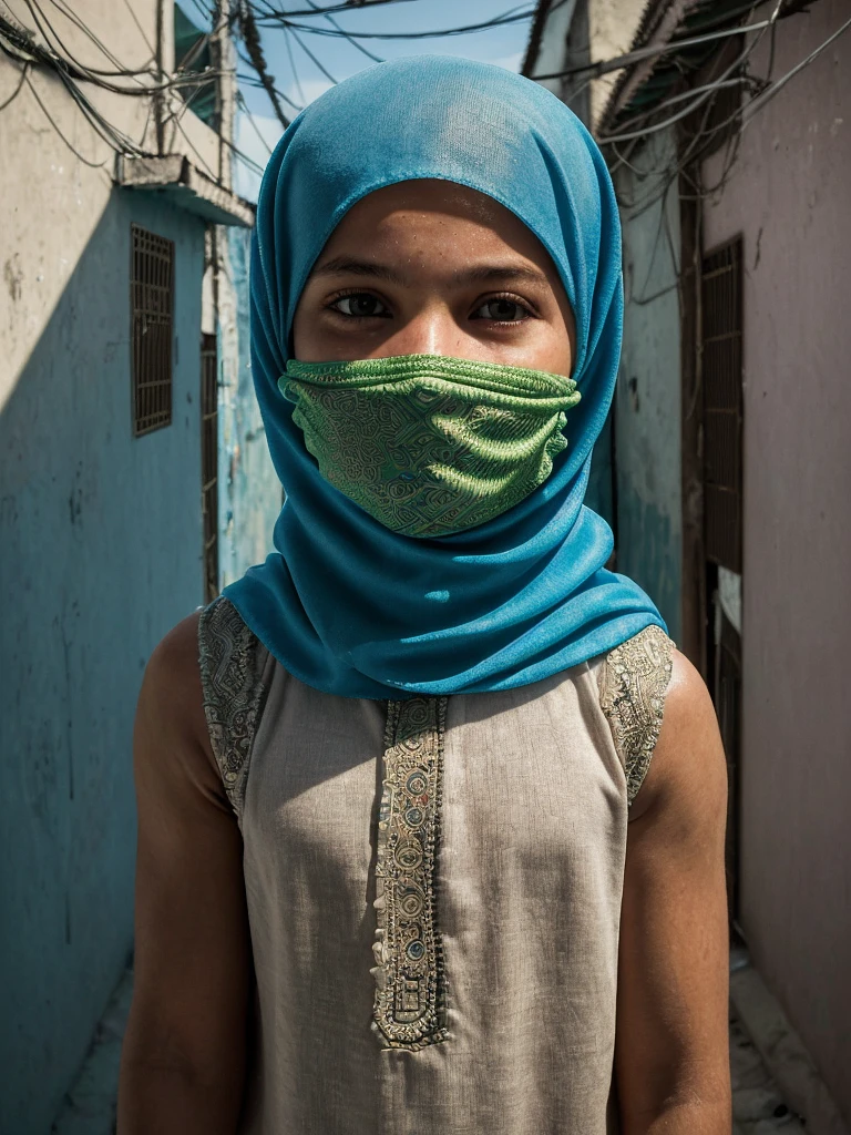 portrait of young muslim dressing balaclava in Rio de Janeiro favela, ultra realistic, 8k full HD, low angle, unreal engine 5, cinematic, masterpiece, insane detail, real photography, bright colors, sun-soaked colours, Fujifilm X-T4, Sony FE 85mm --ar 900:1600 --s 750 --style raw --v 5. 2