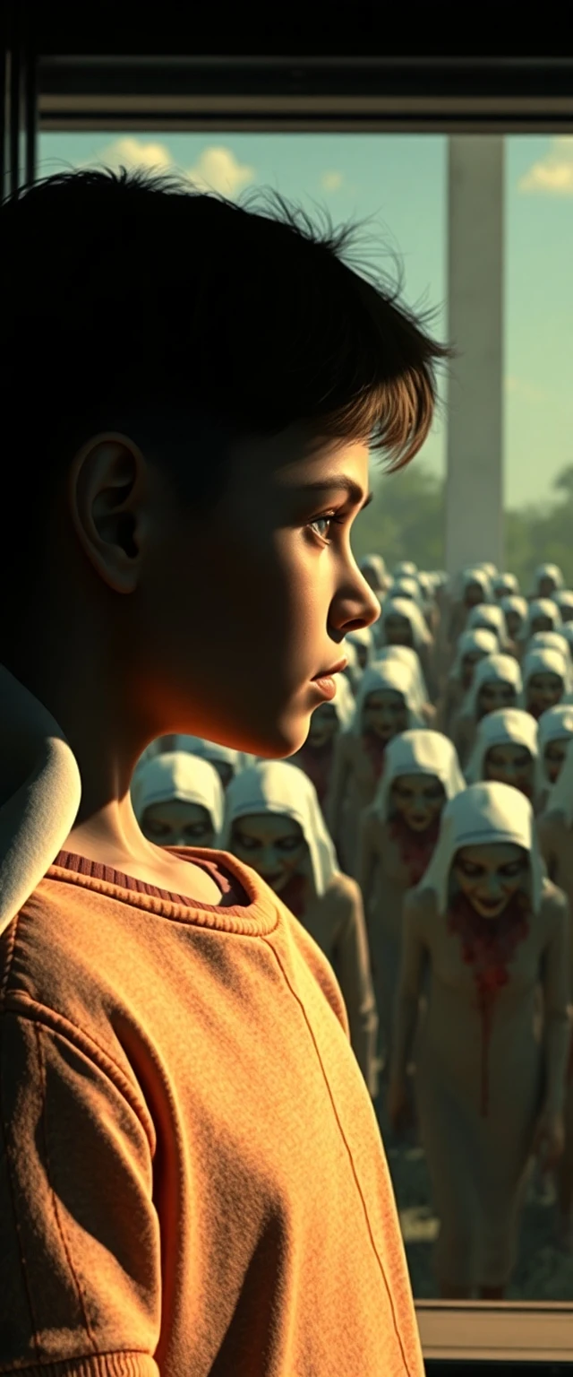 A boy looking from a window at daylight and sees many walking womem zombies . Their body are exposed and covered with blood . Many nuns zombies . Hyperrealistic. Hyper details . Hyper face and body details . 8k . High quality .