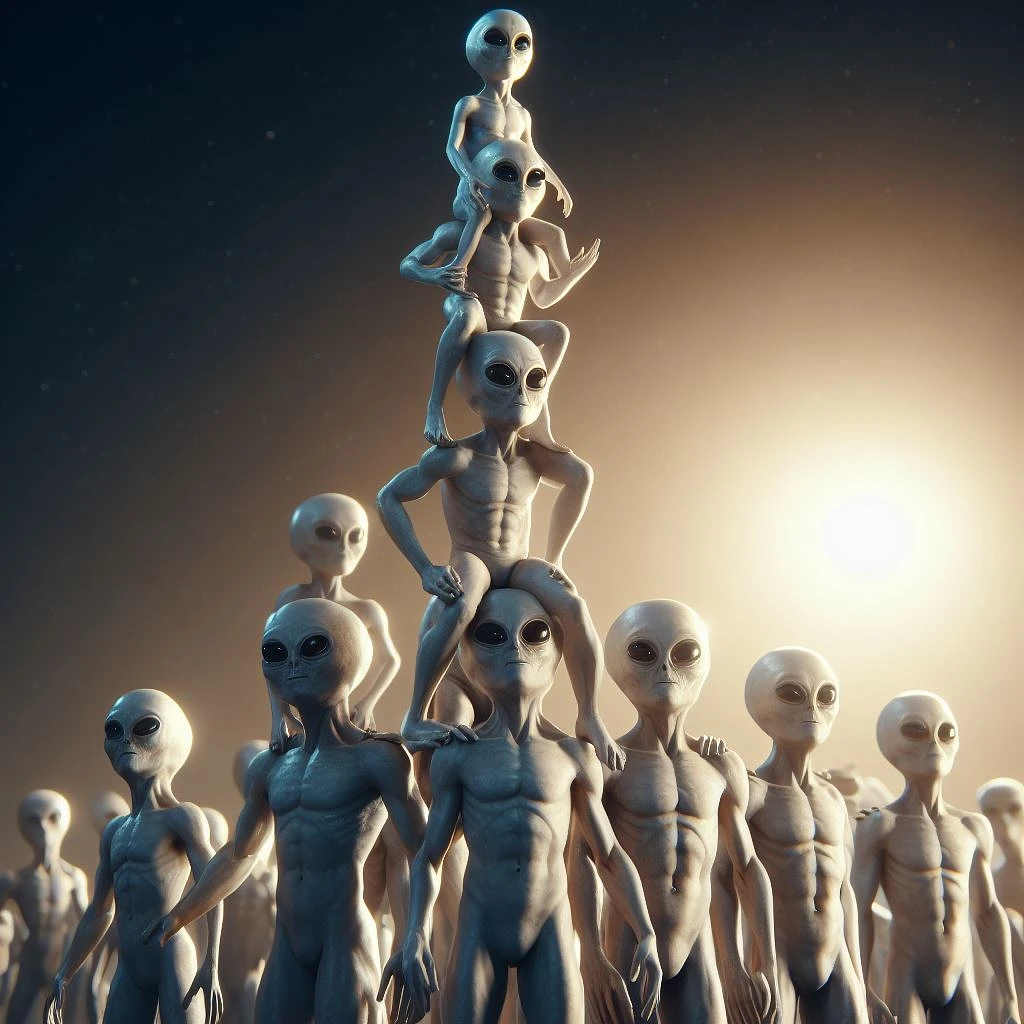 A photo of a stack of happy Alien people standing on each others shoulders, human pyramid, cinematic, photorealistic