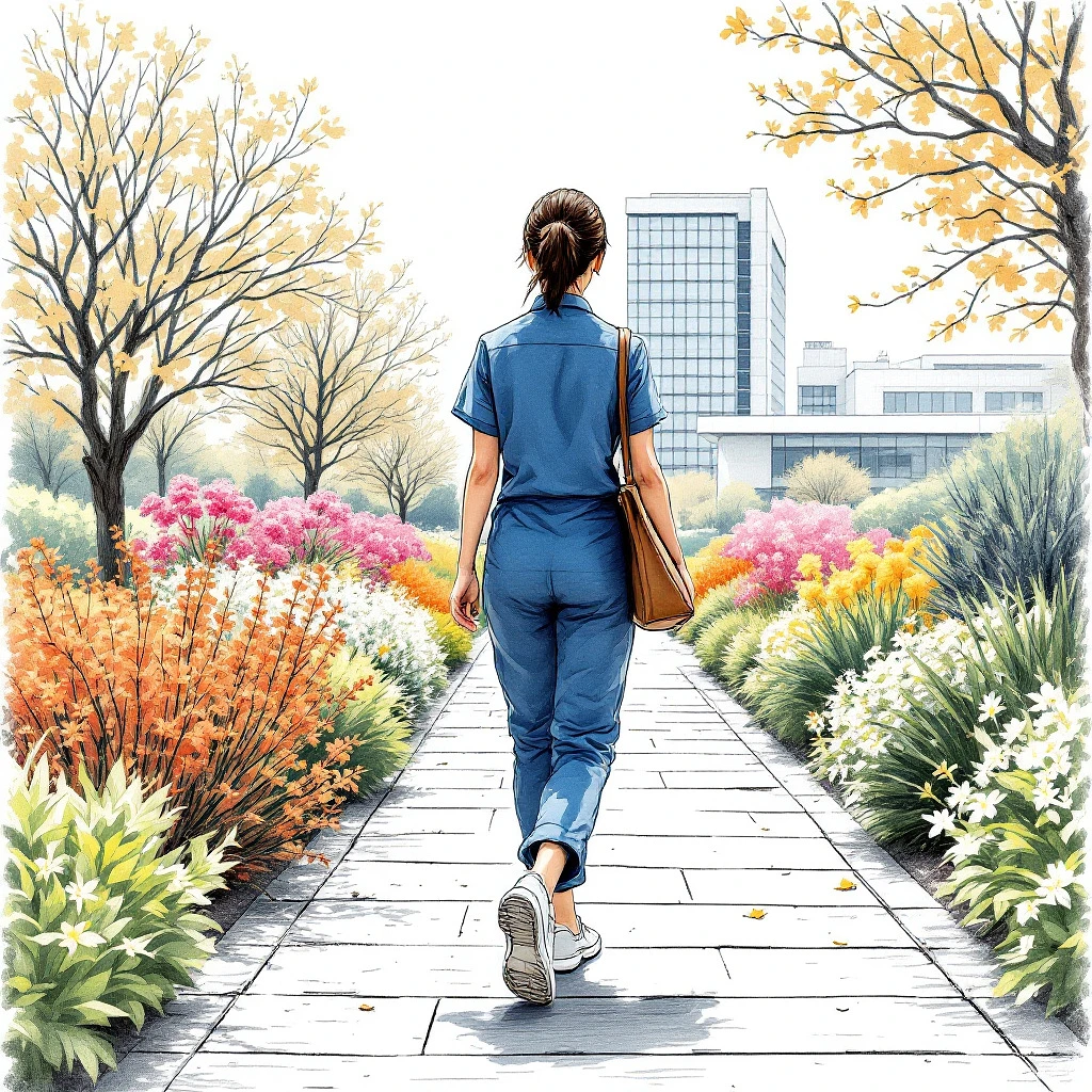 Pencil sketch drawing of a Japanese female worker walking along a modern garden path lined with seasonal flowers. She is wearing a blue work uniform and white running shoes, seen from behind. Her left foot is stepping forward naturally, and her right foot is slightly raised. She is carrying a small brown work bag. In the distance, there is a modern office building with clean architecture, not traditional or fantasy style. The entire image is in pencil sketch style, monochrome or light shading, no color, no anime, no fantasy, no historical elements