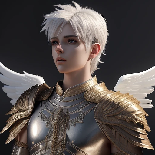 Male divine androgynous gorgeous, with a white gold high angelic armor, dark epic, roman toga, cinematic lighting, heaven background, concept art, highly detailed, photorealistic, 4 k, --ar 10:16