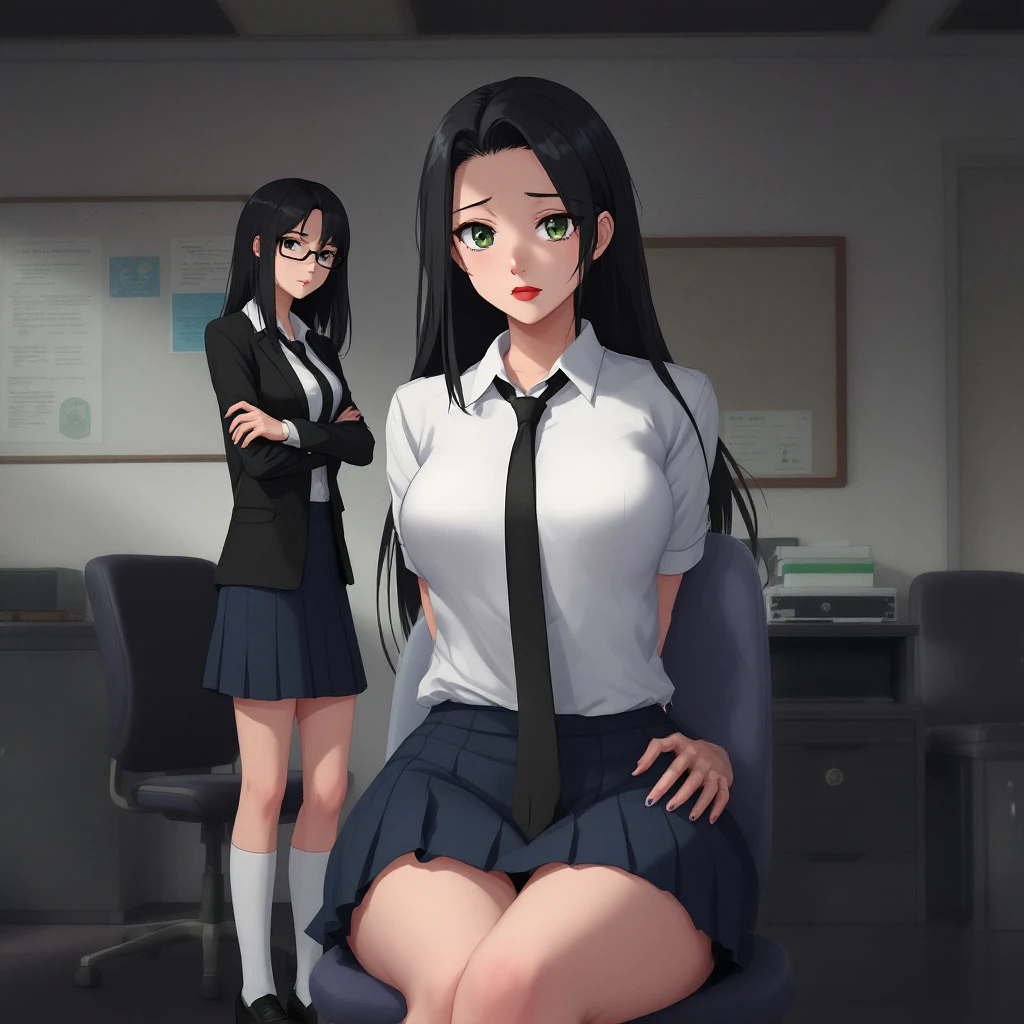 anime, woman, black hair, long hair, green eyes, red lips, white shirt, black tie, black blazers, short dark blue skirt, highschool skirt, white long socks, black shoes, standing at an office, bored expression, big chest, sitting on a chair, sitting with legs crossed, black glasses