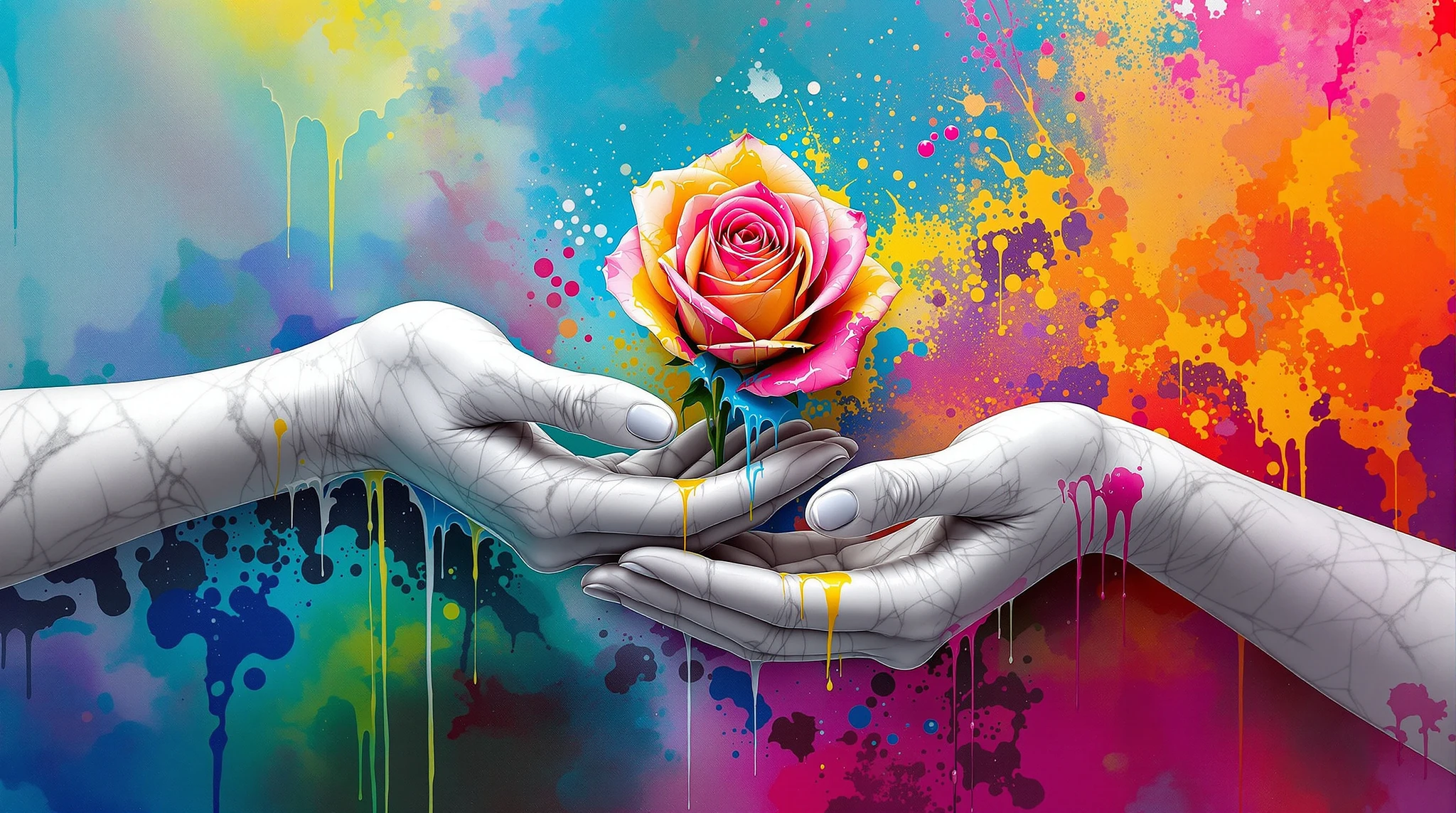 random pose, two hands white marble skin, giving a rose , the flower is made of dripping liquid paint, contrasting colored gradient background with paint splashes