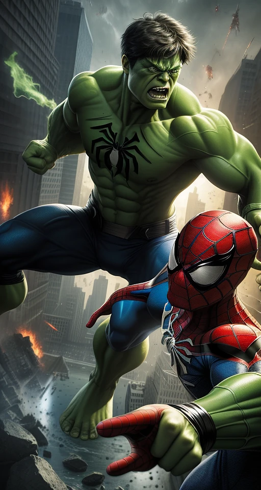 A superhero going into battle to fight a villain, battle of ideals, Heroic, epic, Realism, hulk versus Spiderman --v 4