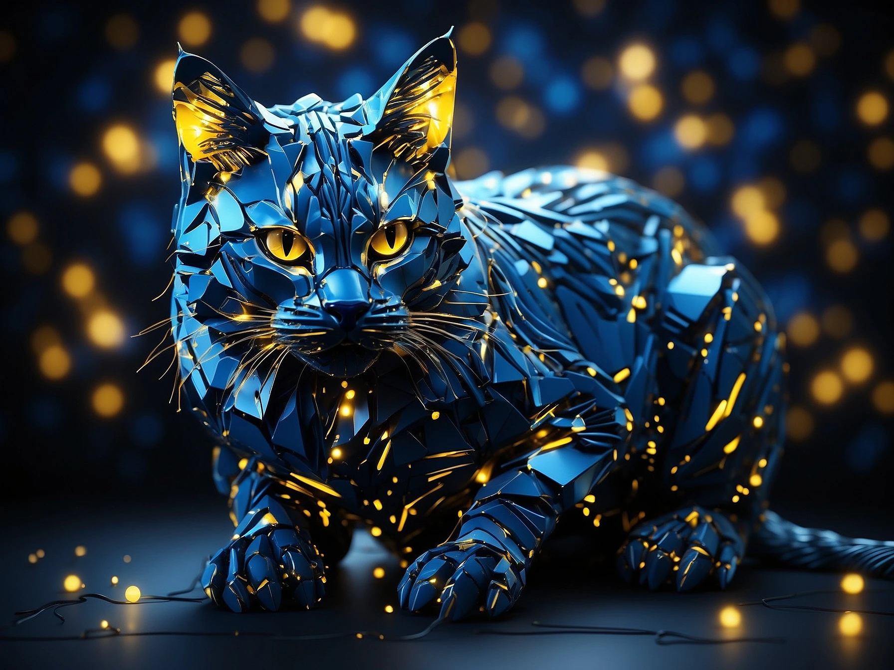 a paper sculpture of a cat with yellow eyes, computer graphics by Mike Winkelmann, cgsociety, computer art, rendered in cinema4d, rendered in maya, quantum wavetracing